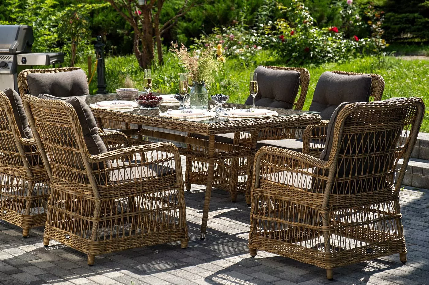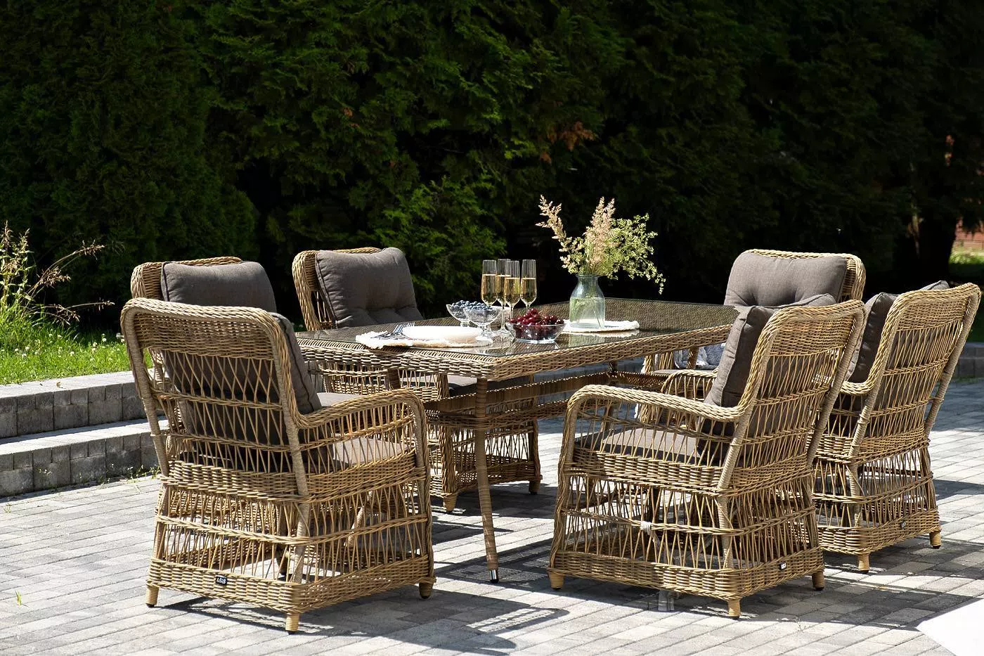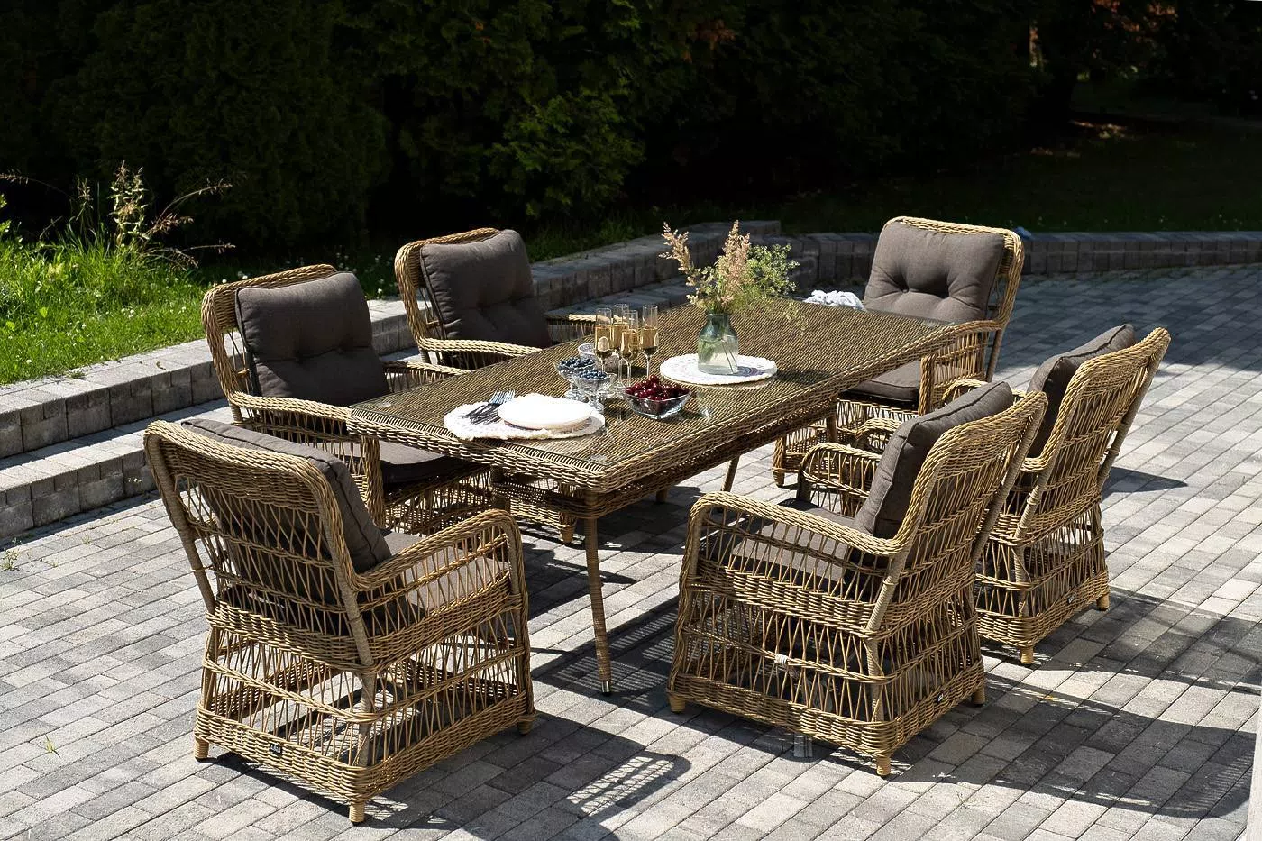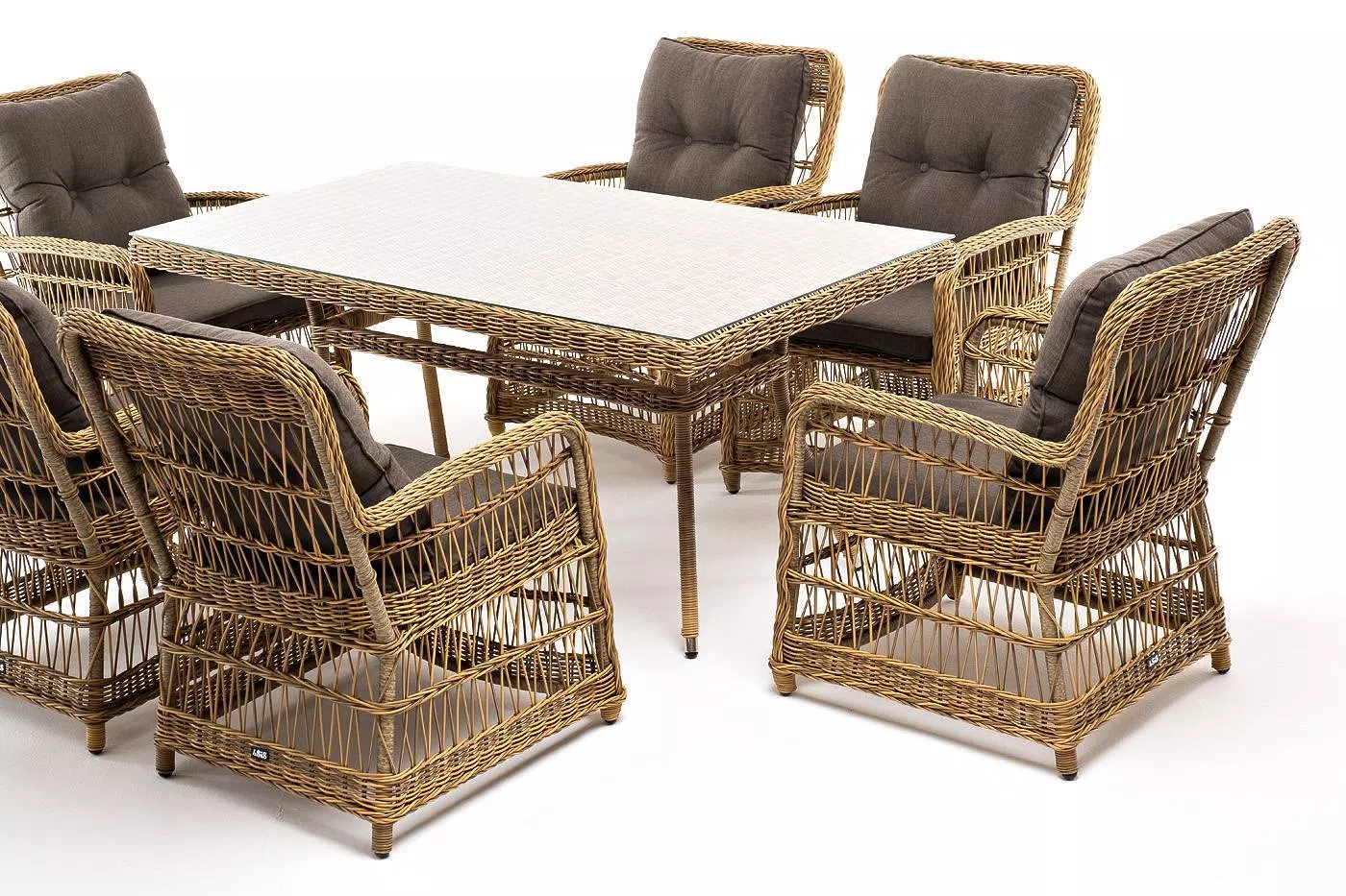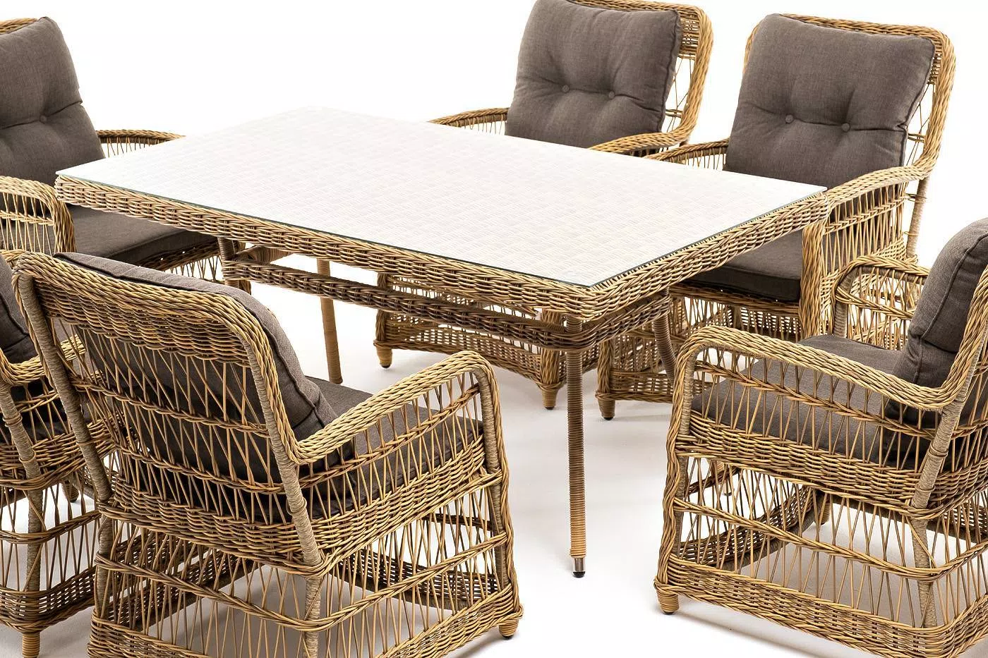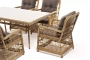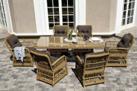 Садовая обеденная группа на 6 персон «Цесена» из ротанга. В комплекте: большой прямоугольный обеденный стол (1600×900×750 мм) и 6 кресел (600×800×910 мм).