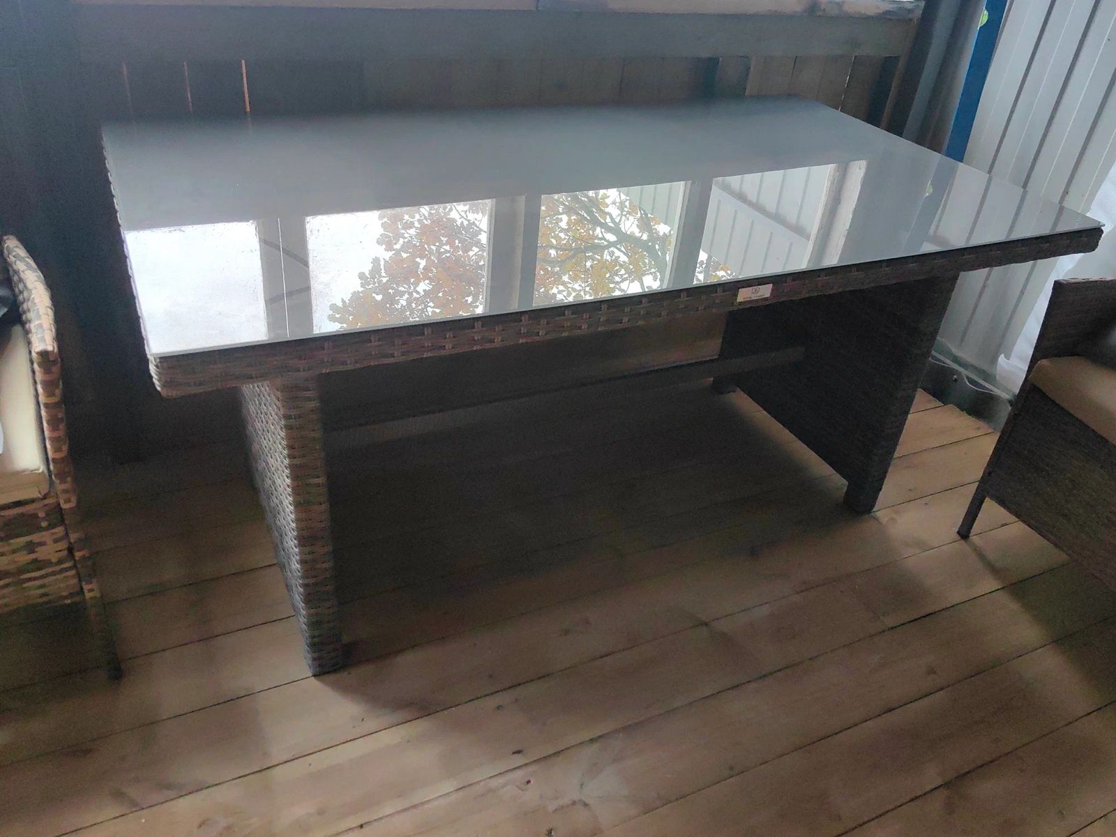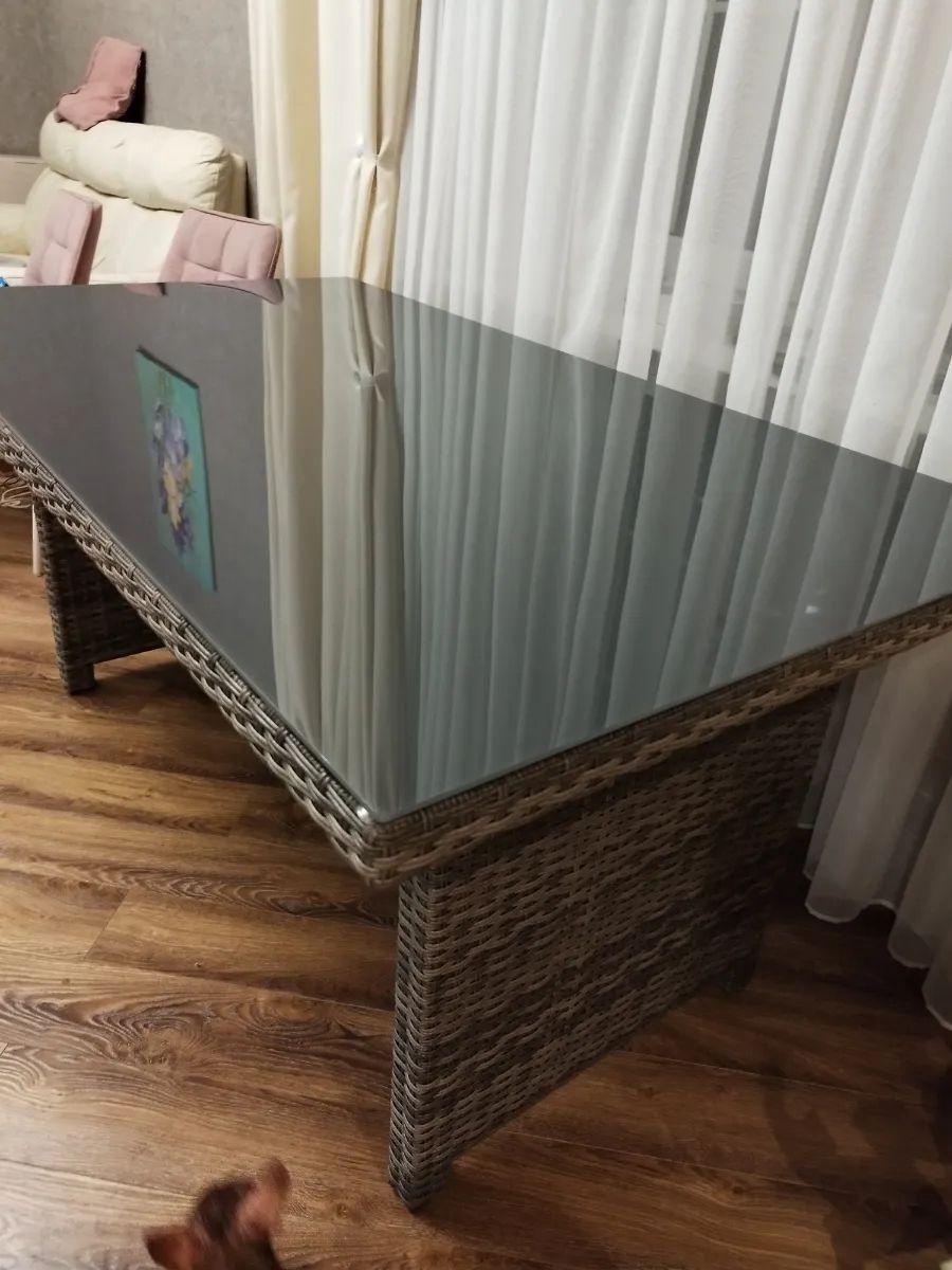 Обеденный стол из комплекта FIONA, размеры 160х80х69. Стальной каркас, полукруглое двойное плетение ручной работы. Столешница - закалённое стекло. Цвет плетения - серый.