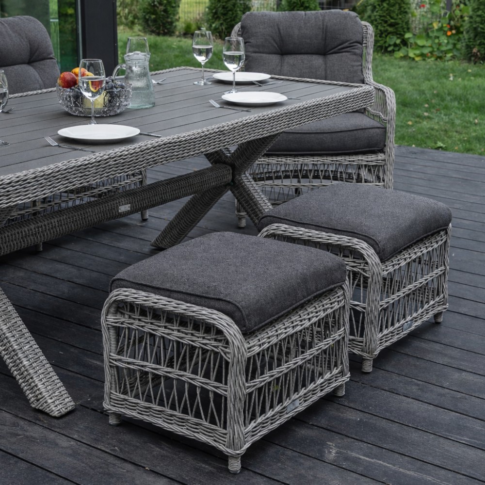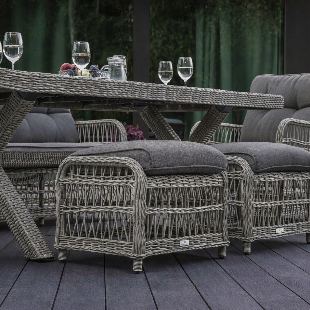 Представленные в наборе предметы изготовлены на основе прочного алюминиевого каркаса, что позволяет сохранять им свою целостность и не расшатываться под влиянием высоких весовых и прочих механических нагрузок. В качестве элемента для декоративного оформления производитель использовал искусственный ротанг, который:- не выгорает под влиянием прямых солнечных лучей;