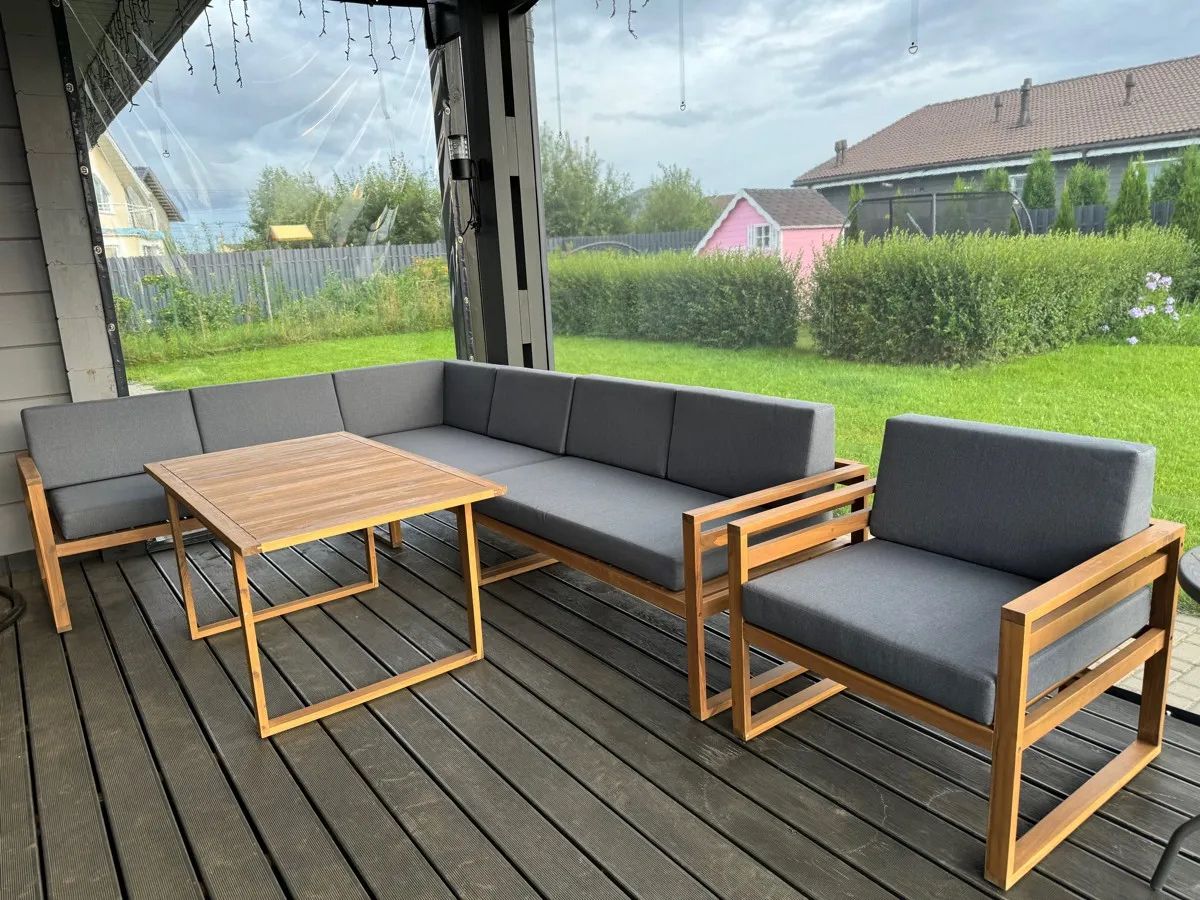 Угловой диван обеспечивает удобство и уют, дополняясь подушками с водоотталкивающими съемными чехлами. Стол и кресло гармонично вписываются в общий ансамбль, выдерживая ежедневное использование. Мебель устойчива к температурным перепадам и рассчитана на долгий срок службы. Цвет — натуральный, подушки серого оттенка. Гарантия — 1 год, срок эксплуатации — до 10 лет.