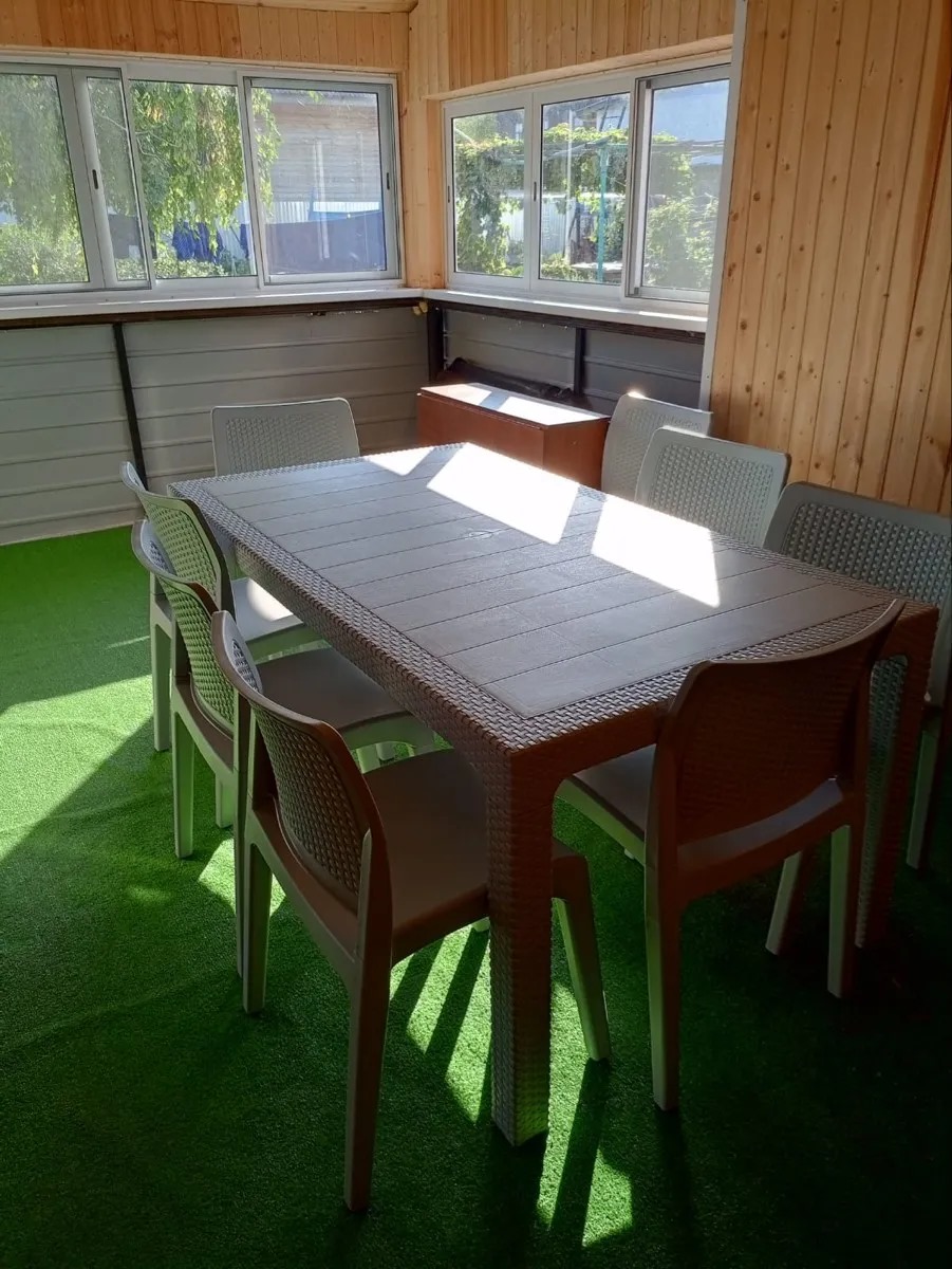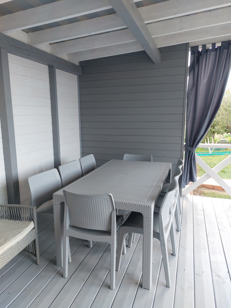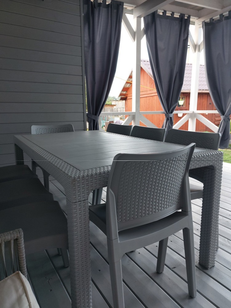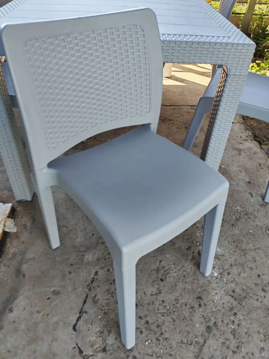 Создайте уютную обеденную зону для большой компании с восьмиместным комплектом в стильном светло-сером исполнении. В набор входит: