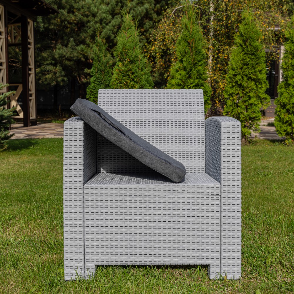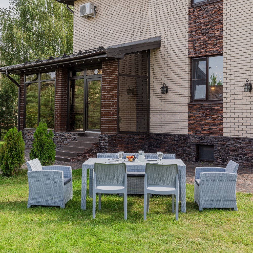 Светло-серые тона мебели создают ощущение воздушности и простора, а прочные полипропиленовые конструкции выдерживают любые капризы погоды. Мягкие подушки с поролоновым наполнителем делают продолжительные застолья по-настоящему комфортными.
