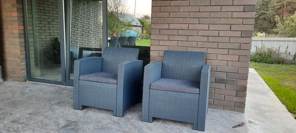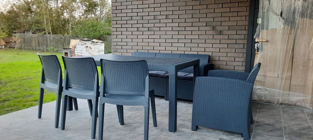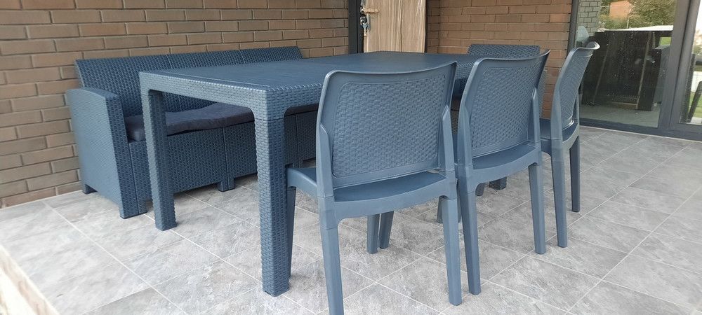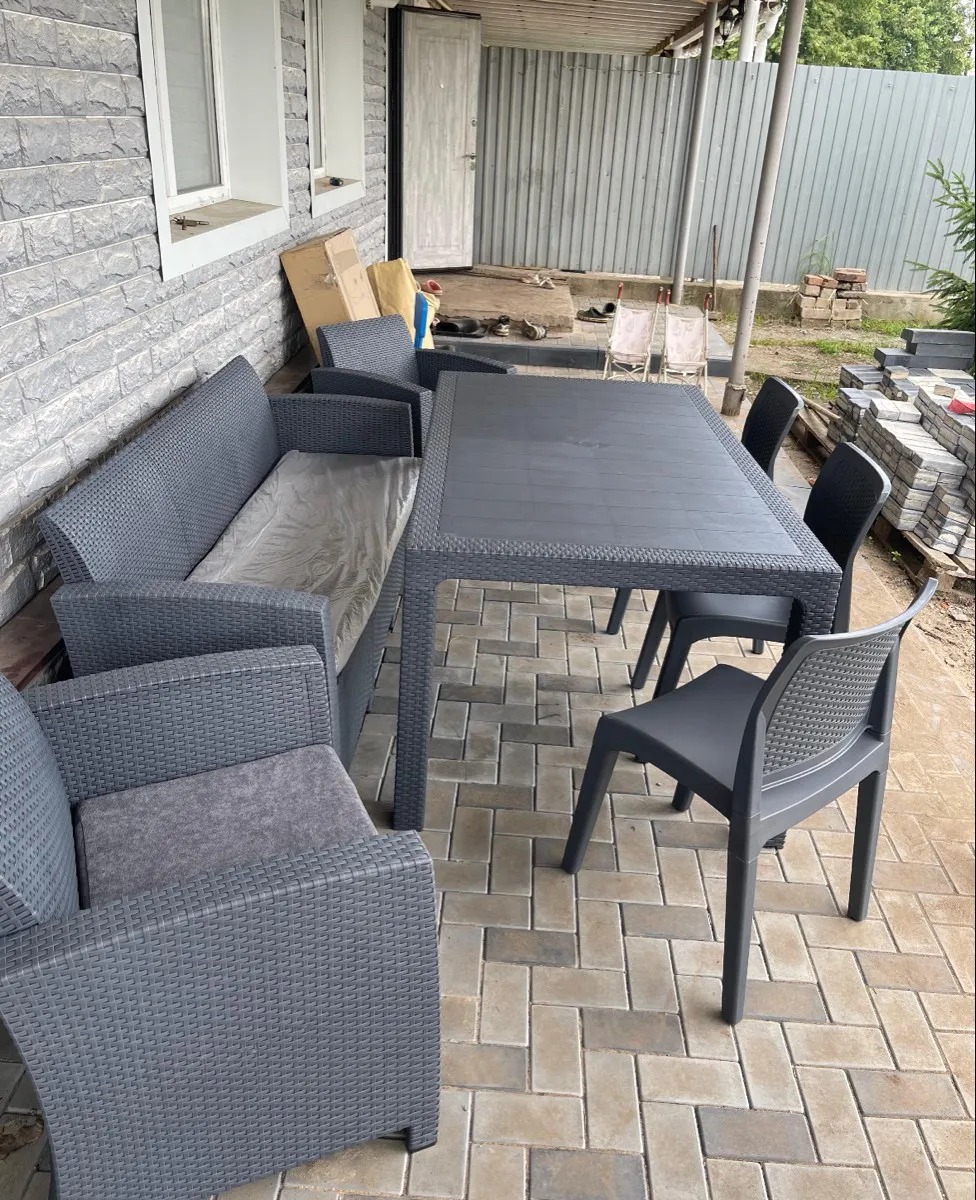 Графитовый цвет мебели придает пространству современный и благородный вид. Все элементы изготовлены из прочного полипропилена, устойчивого к любым погодным условиям. Мягкие подушки с поролоновым наполнителем обеспечивают комфорт во время продолжительных застолий.