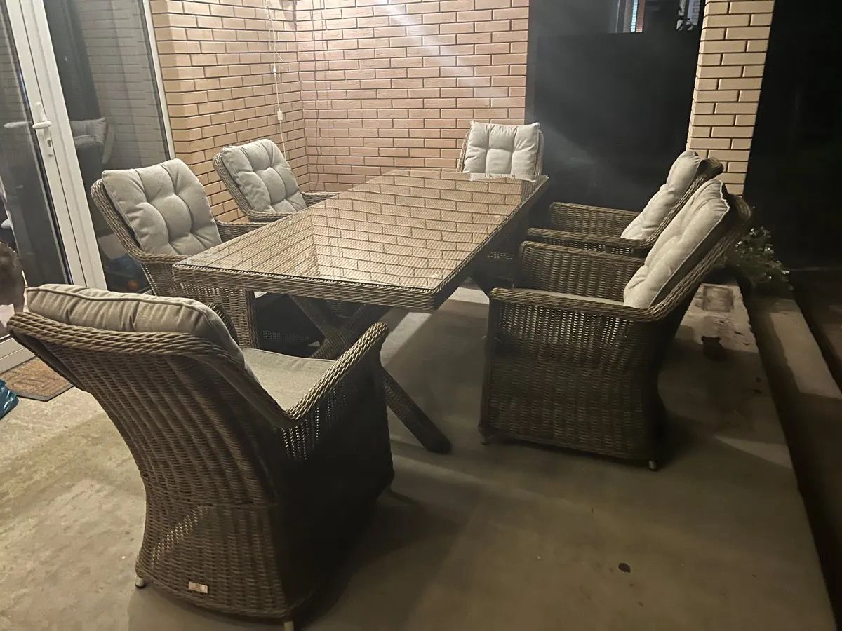 Шесть удобных кресел с мягкими подушками и обеденный стол оптимального размера создают обстановку, в которой хочется собраться, пообщаться и не спешить. Эргономика продумана до мелочей — сидеть удобно даже долго, а устойчивый стол позволяет сервировать всё необходимое без тесноты.