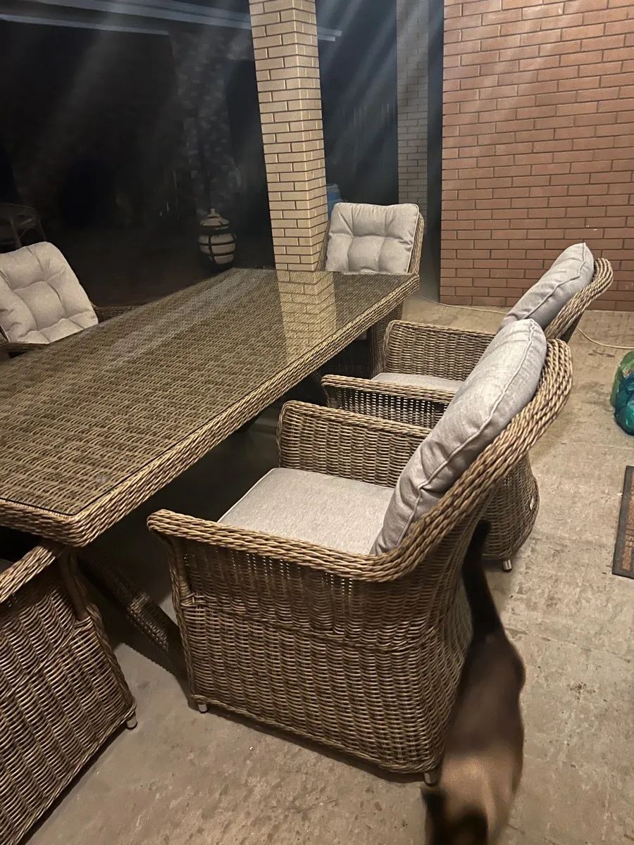 Мебель выполнена из прочного каркаса с оплёткой из искусственного ротанга, который отлично переносит солнце, влагу и резкие смены температуры. Комплект рассчитан на уличное использование, не требует сложного ухода и долго сохраняет презентабельный вид.