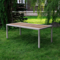 Стол выполнен из искусственного ротанга ручного плетения, который придаёт изделию изысканный внешний вид. Каркас из стали с порошковым покрытием обеспечивает устойчивость и надёжность конструкции. Столешница из поливуда, имитирующего натуральное дерево, устойчива к влаге и солнечному свету, сохраняя свой привлекательный вид даже при длительной эксплуатации.