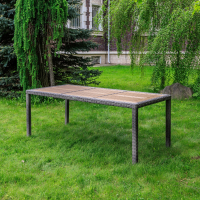 Стол выполнен из искусственного ротанга ручного плетения, который придаёт изделию изысканный внешний вид. Каркас из стали с порошковым покрытием обеспечивает устойчивость и надёжность конструкции. Столешница из поливуда, имитирующего натуральное дерево, устойчива к влаге и солнечному свету, сохраняя свой привлекательный вид даже при длительной эксплуатации.