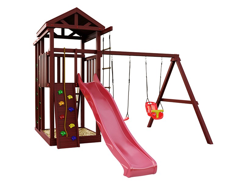 Комплектация детской площадки "Панда Фани Fort": конструкция башни, скалодром с камнями, конструкция лестница с металлическими перекладинами, волновая горка 3 м., качели одиночные, качели со спинкой, песочница, деревянная лестница, веревочная лестница. Размеры: длина 4,40 м., высота 3,25 м., ширина 4,35 м.