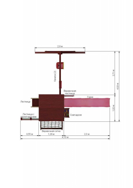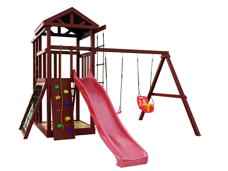 ПАНДА ФАНИ FORT С СЕТКОЙ детская игровая площадка включает в себя: конструкцию башни, конструкцию скалодром с камнями, волновую горку 3 м., качели одиночные, качели со спинкой, песочницу, деревянную лестницу, веревочную лестницу, веревочную сетку для лазания