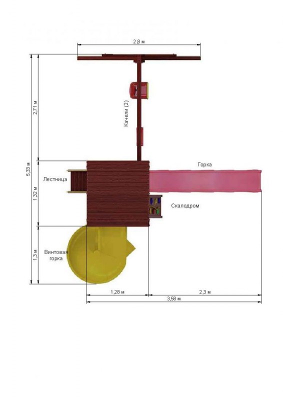 ПАНДА ФАНИ С ВИНТОВОЙ ГОРКОЙ - это детский игровой комплекс в который входит: конструкция башни, конструкция скалодром с камнями, волновая горка 3 м., горка винтовая, качели одиночные, качели со спинкой, песочница и деревянная лестница. Размеры: длина 5,30 м., высота 3,25 м., ширина 4,35 м.