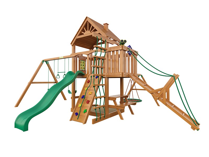 ПИРАТСКИЙ ДОМ ДЕРЕВО - это детский игровой комплекс в который входит: двухуровневый домик, волновая горка, веревочная лестница, деревянная лестница, трап, конструкция скалодром с камнями, гибкие качели на цепях, трапеция с кольцами на цепях, качельный модуль, качели Гнездо, доска для игры в “Крестики-нолики”, лавочка-столик, песочница, бинокль/телескоп, руль/штурвал. Размеры: длина 7,5 м., высота 3,7 м., ширина 5,8 м.