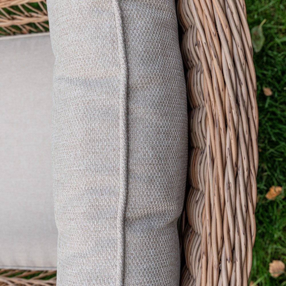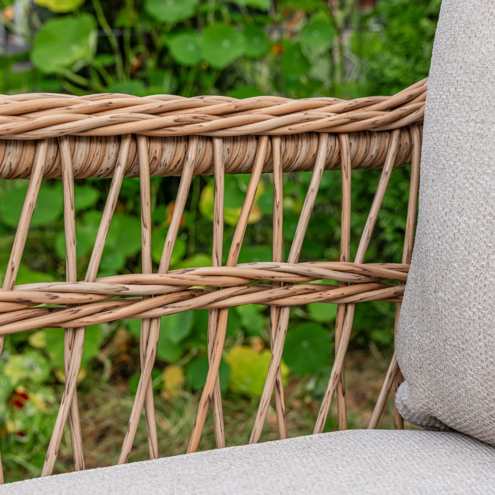 Кресло изготовлено на основе прочного алюминиевого каркаса, обеспечивающего надежную поддержку и стабильность. Этот материал способен выдерживать различные нагрузки, что делает кресло долговечным и надежным элементом мебели. Декоративное плетение из искусственного ротанга придает креслу изысканный вид, точно имитируя натуральную тропическую лиану.
