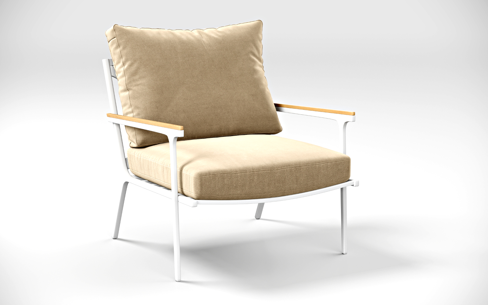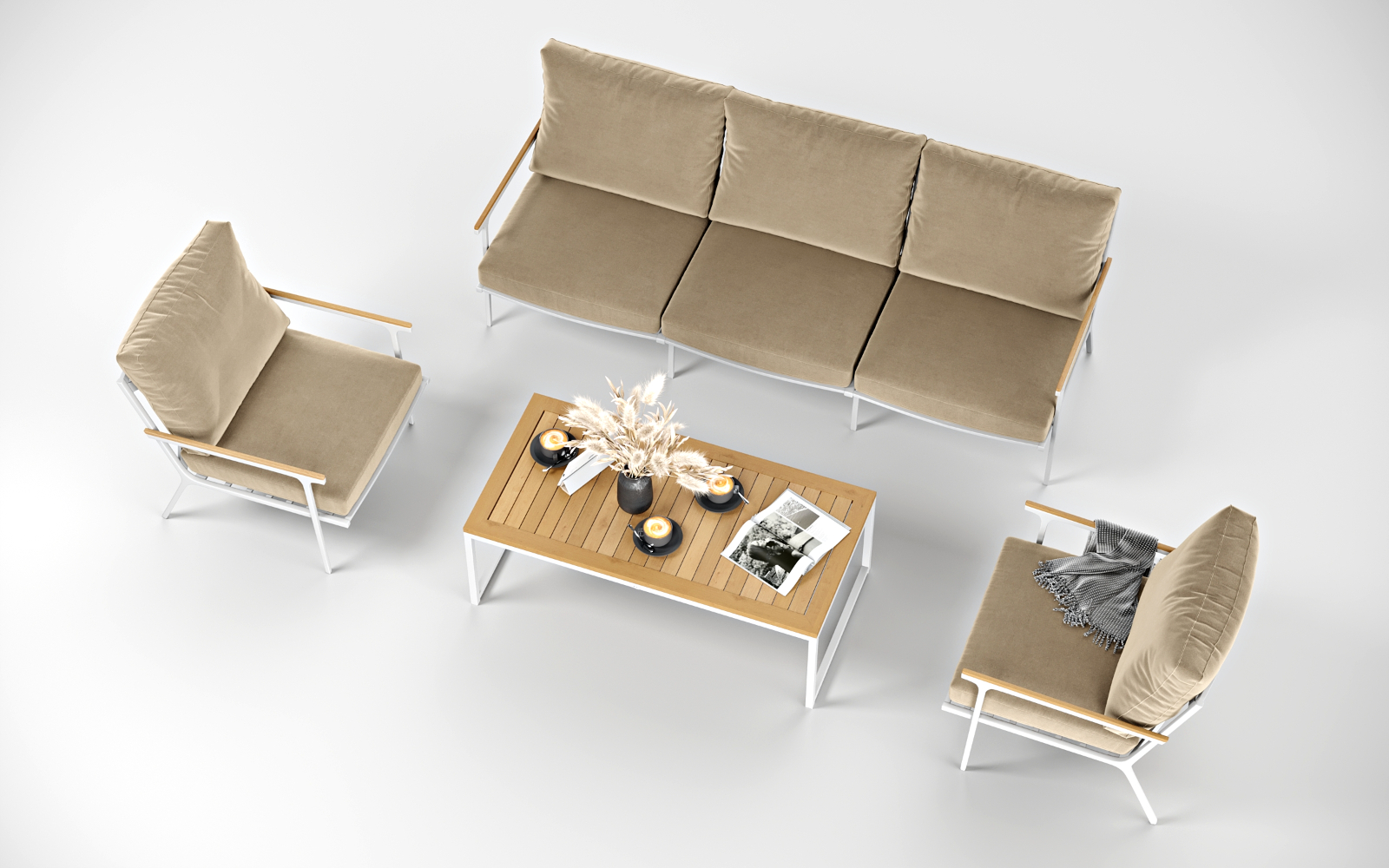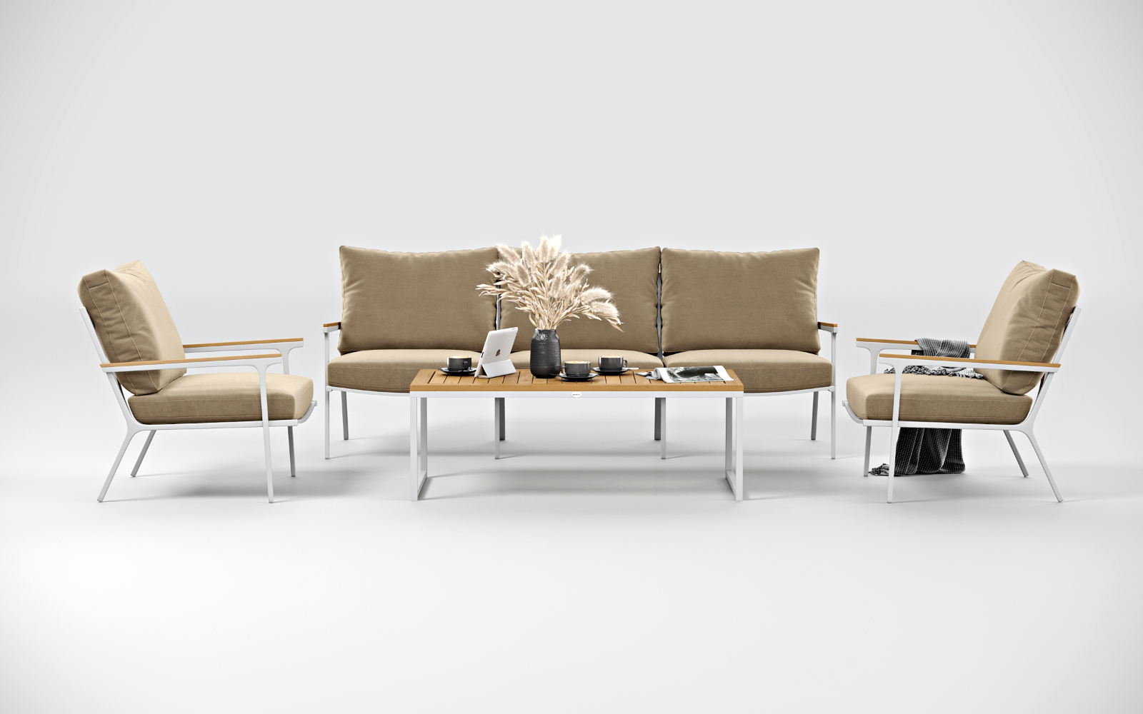 Материалы и цвета: каркас мебели выполнен из всесезонного, долговечного алюминия с порошковым покрытием белого цвета, планки столешницы и подлокотники дивана и кресел изготовлены из благородного тика, удобные подушки спинок и сидений обшиты уличной тканью (олефин) бежевого цвета. Ткань не выгорает под прямыми солнечными лучами, обладает хорошими водоотталкивающими свойствами. Толщина подушек 12 см. Чехлы схемные.
