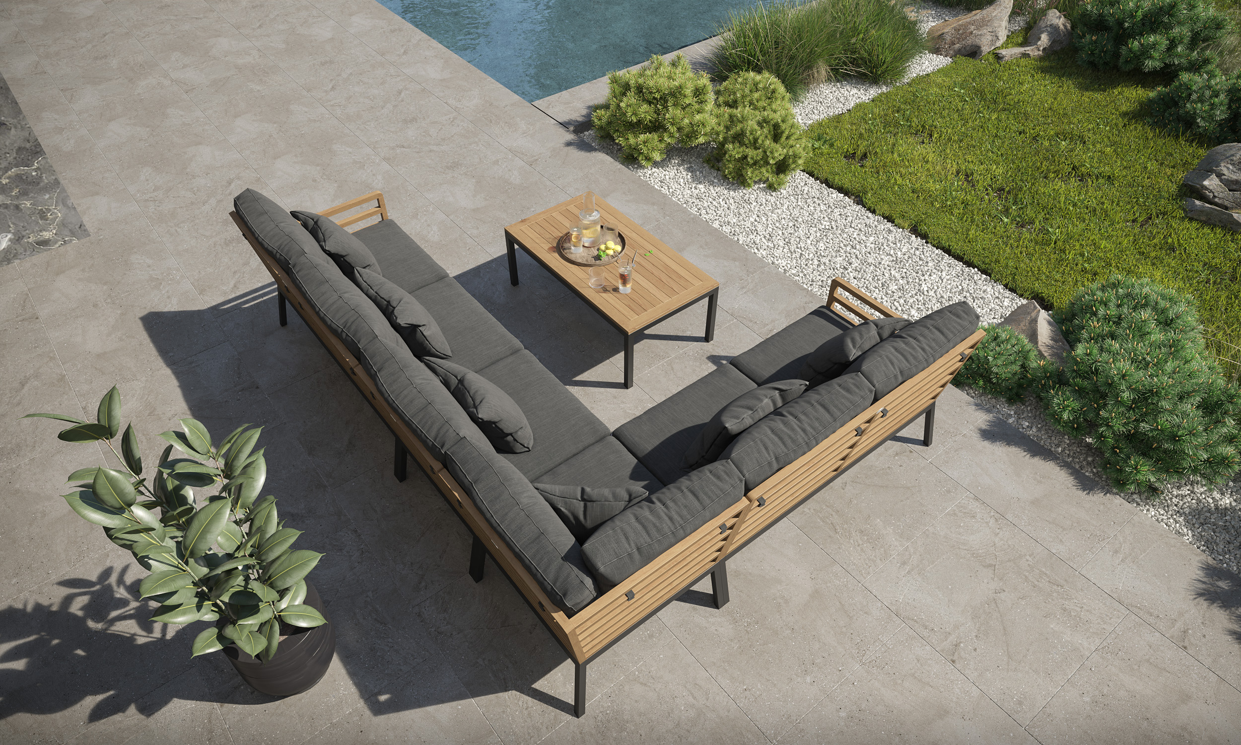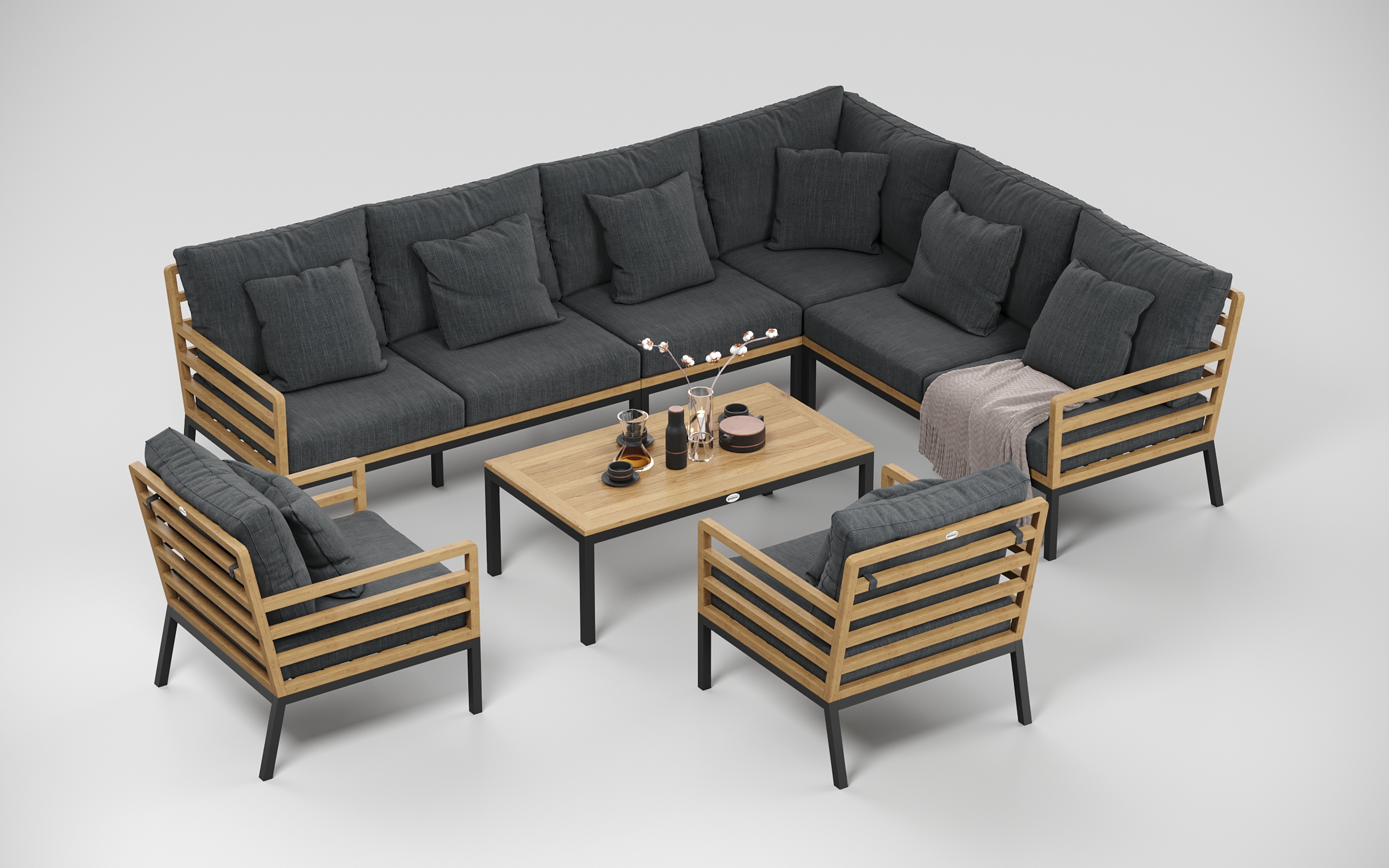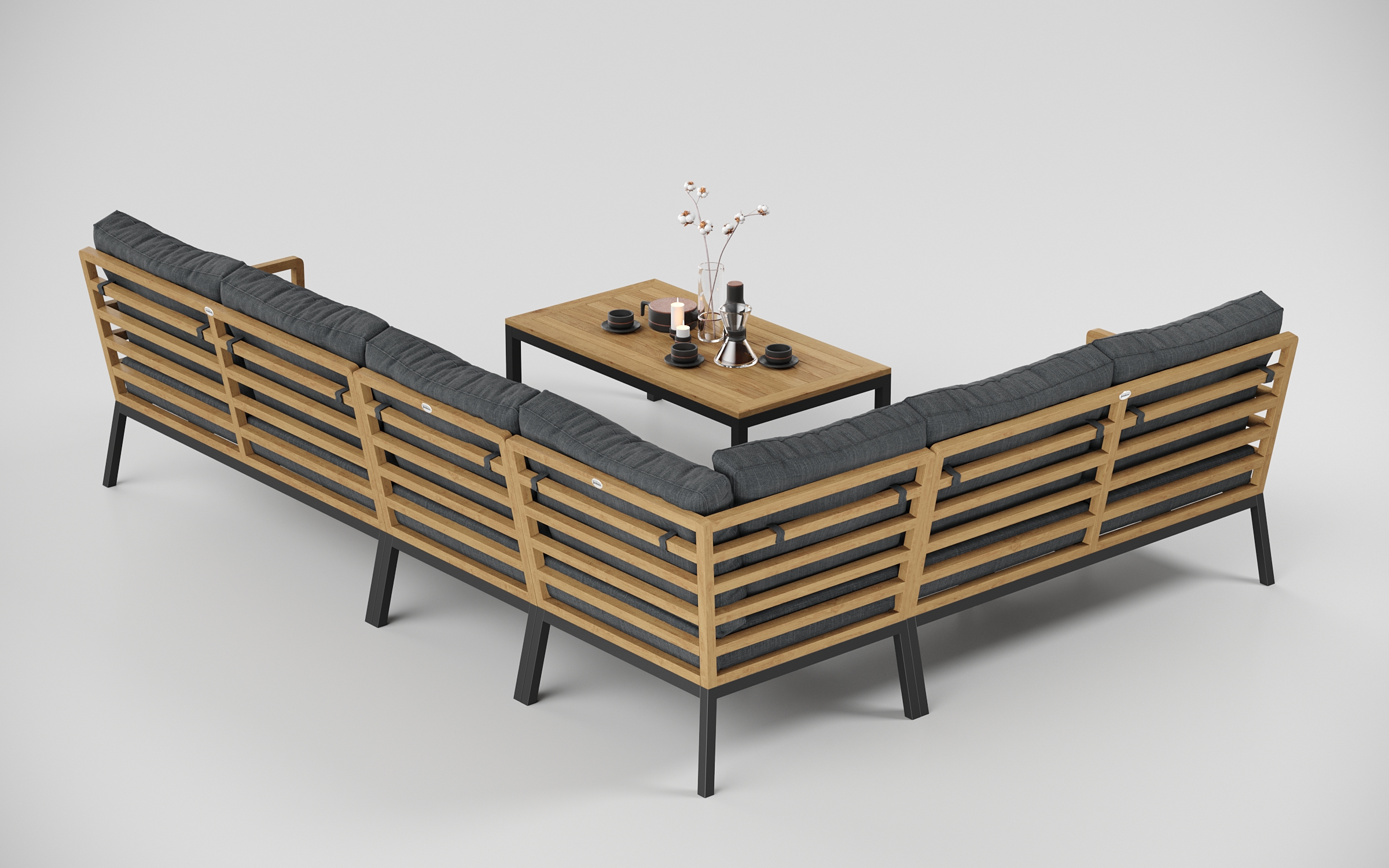 Premium PatioCalma M – винтажная классика с 4 диванами в современном стиле. Непроходящая мода. Возможность расположения модулей в разных вариантах. Захватывающая комбинация прочного каркаса из тика и надежного подножья из алюминия. Удобные сиденья с подушками из премиальной уличной ткани. Ткань устойчива к ультрафиолетовому излучению, водостойкая. Чехлы подушек съемные. Комплект с красивым дизайном и комфортом в использовании.