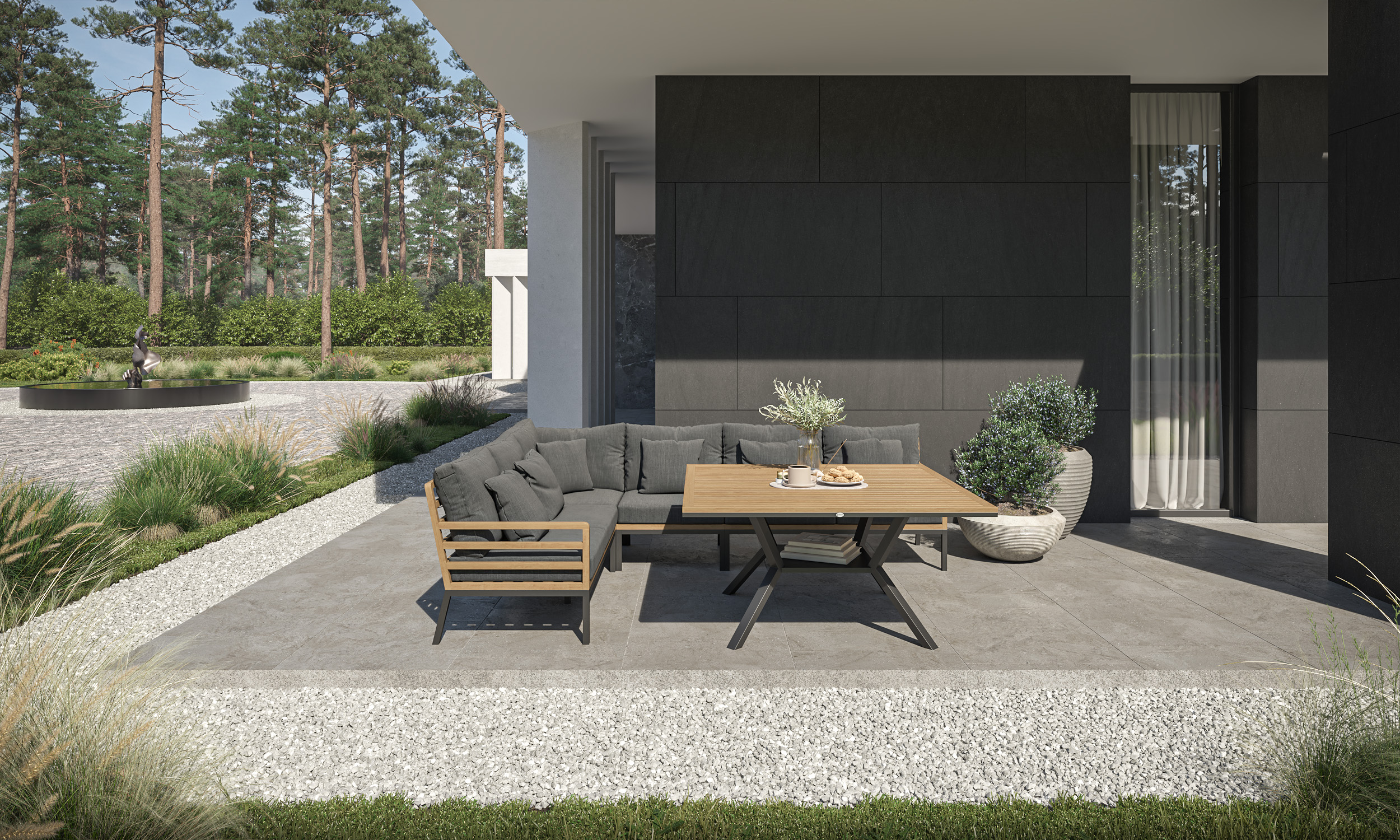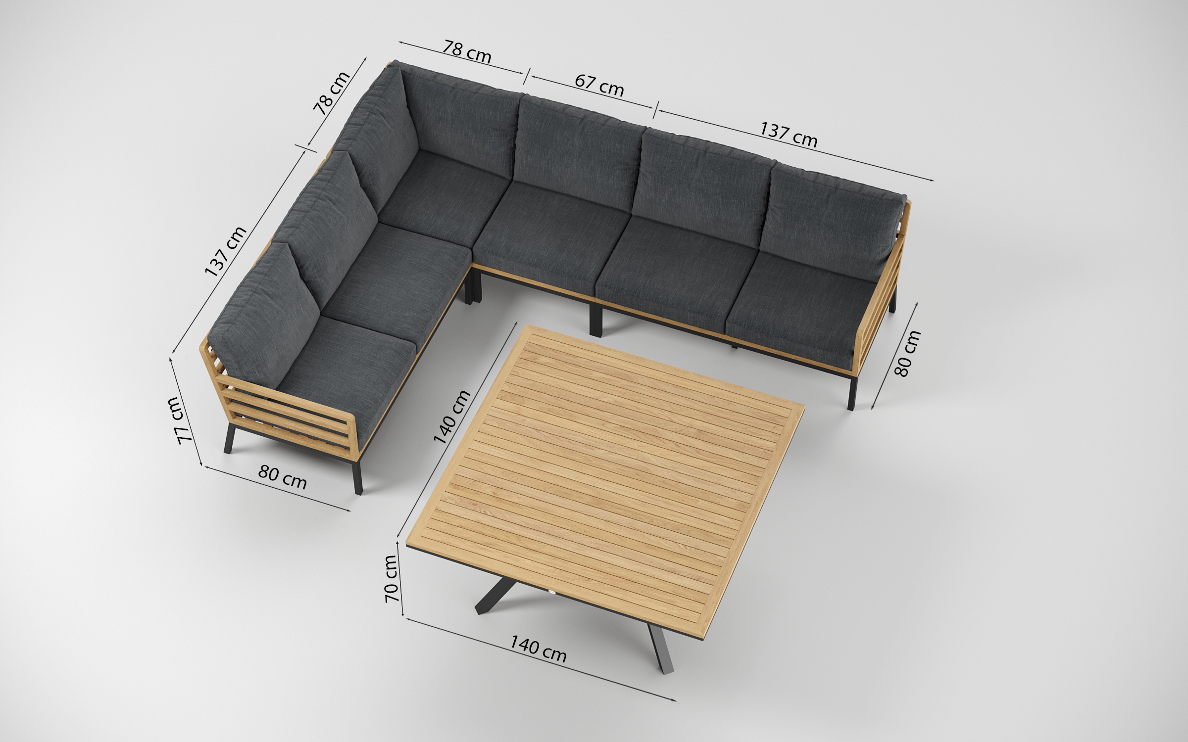 Материалы и цвета: каркас диванов изготовлен из тика, подножье выполнено из всесезонного, долговечного алюминия, с порошковым покрытием темно – серого цвета (карбон), подушки спинки и сидений обшиты премиальной уличной тканью темно – серого цвета. Ткань устойчива к ультрафиолетовому излучению, водостойкая. Толщина подушек 12 см. Чехлы съемные. Каркас стола изготовлен из алюминия, столешница из тиковых планок.