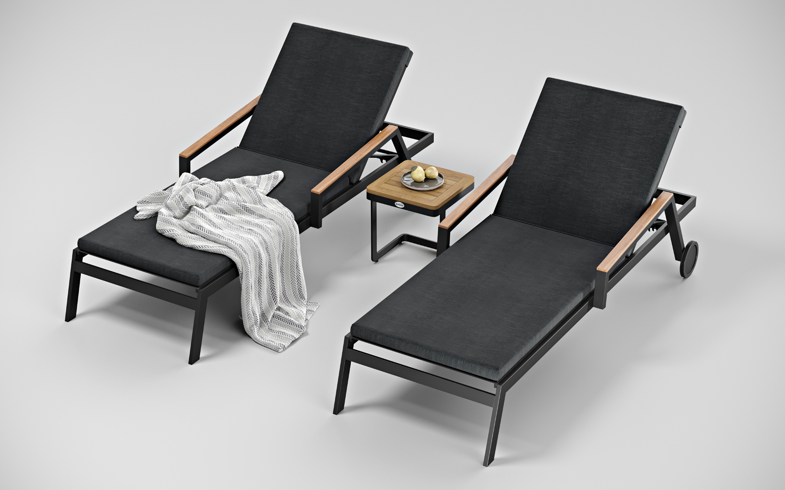 • Материалы: всесезонный алюминий, текстилен, уличная ткань (олефин), подлокотники декорированы тиком, чехол подушки съемный, на "молнии", колеса для смены локации, штабелируются друг в друга для экономии места при  хранении