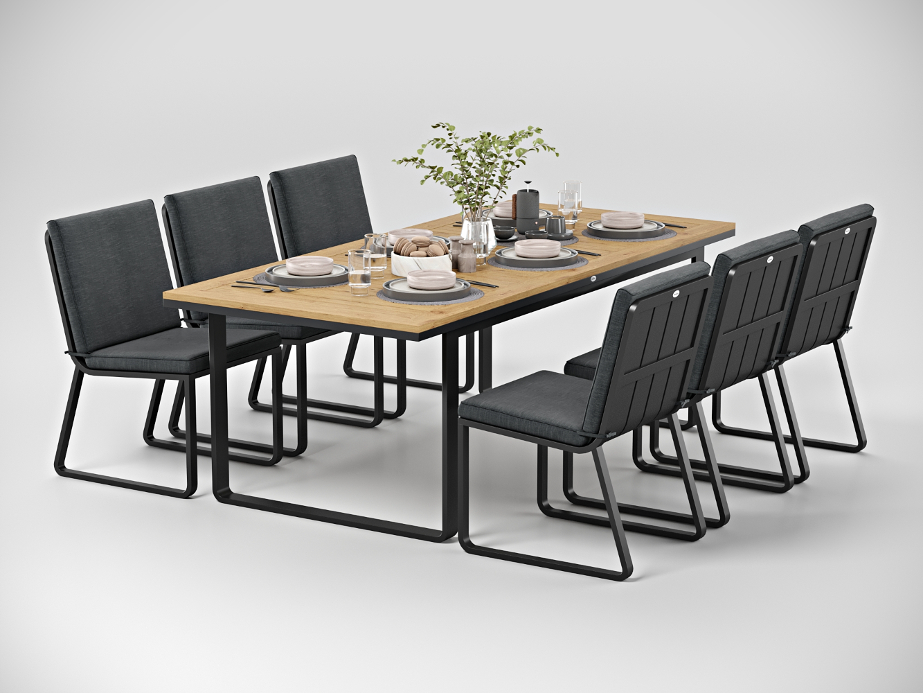 Каркас мебели выполнен из всесезонного алюминия с порошковым покрытием темно-серого цвета (карбон), подушки сидений и спинок обшиты уличной тканью (олефин) темно-серого цвета, толщина подушек 5 см, чехол съемный на "молнии", столешница обеденного стола изготовлена из тиковых планок.