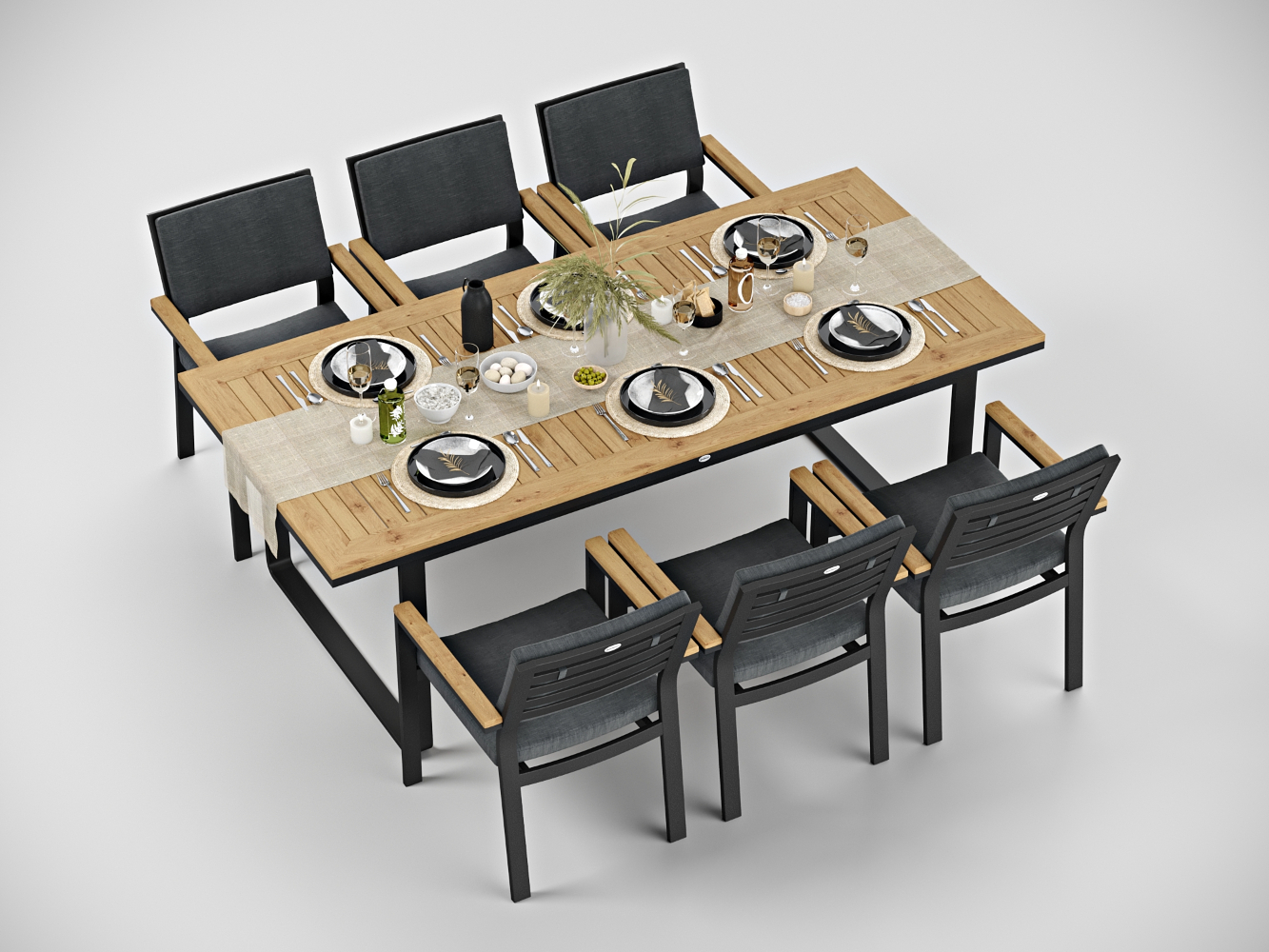 Каркас мебели выполнен из всесезонного алюминия с порошковым покрытием темно-серого цвета (карбон), подлокотники стульев декорированы вставками из тика, подушки сидений и спинок обшиты уличной тканью (олефин) темно - серого цвета, толщина подушек 5 см, чехол съёмный на "молнии", столешница обеденного стола изготовлена из тиковых планок.