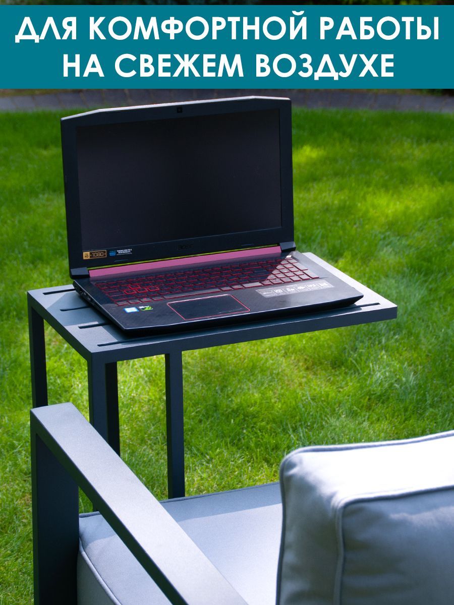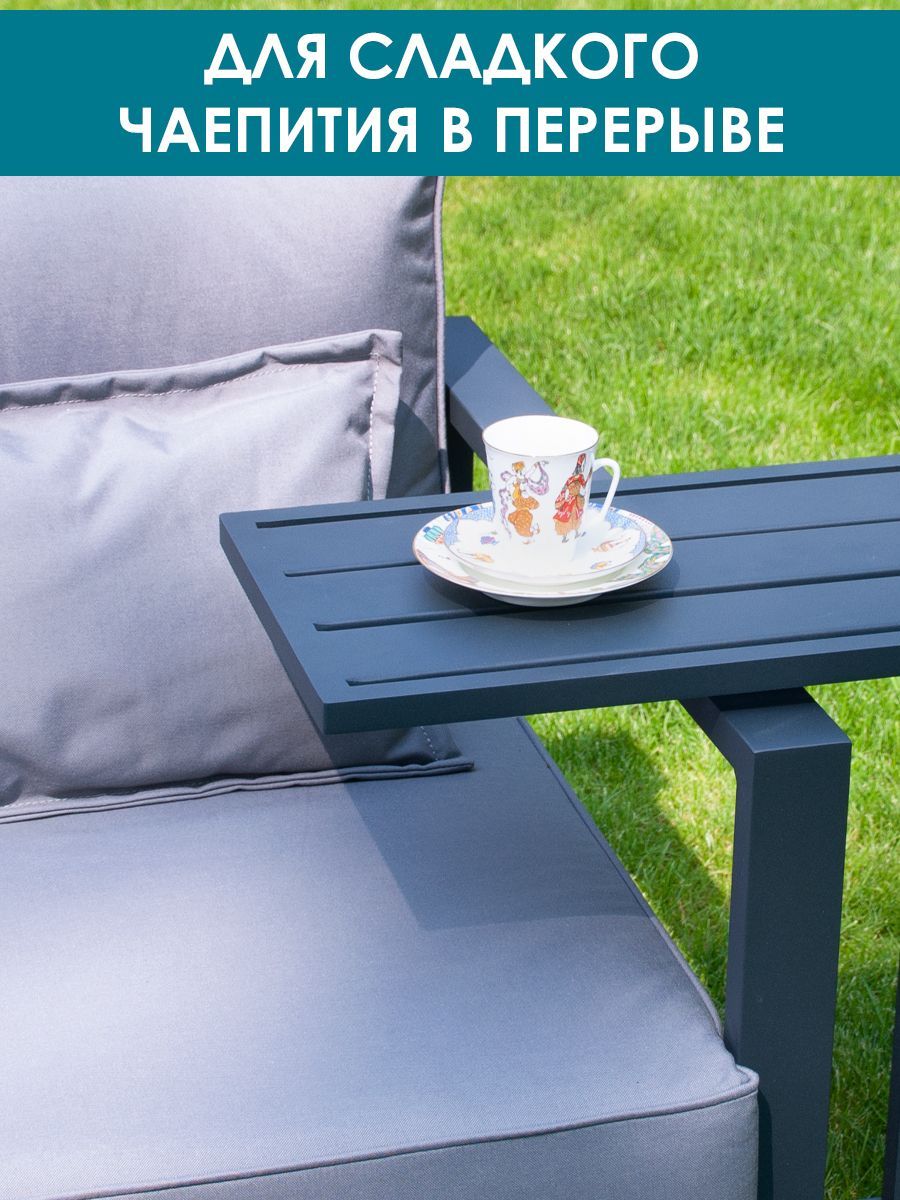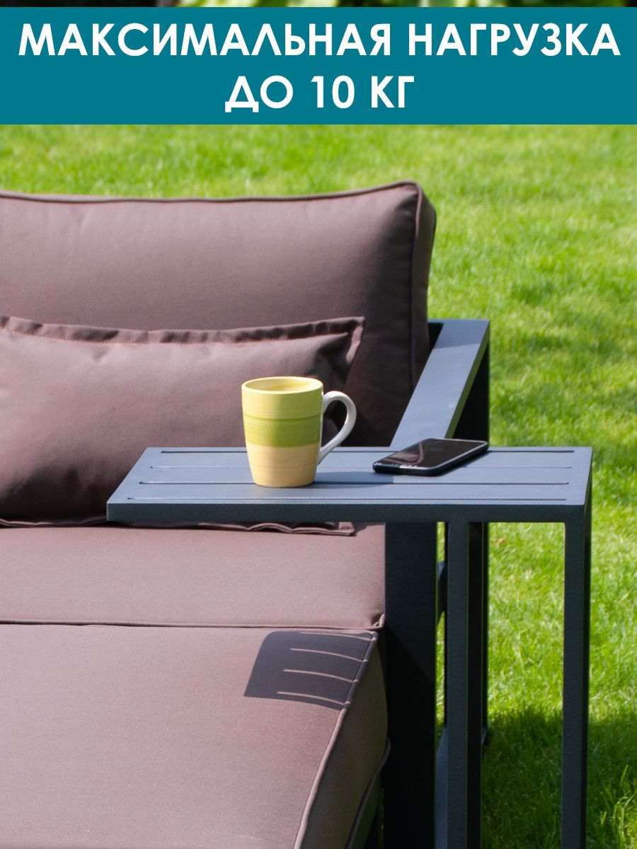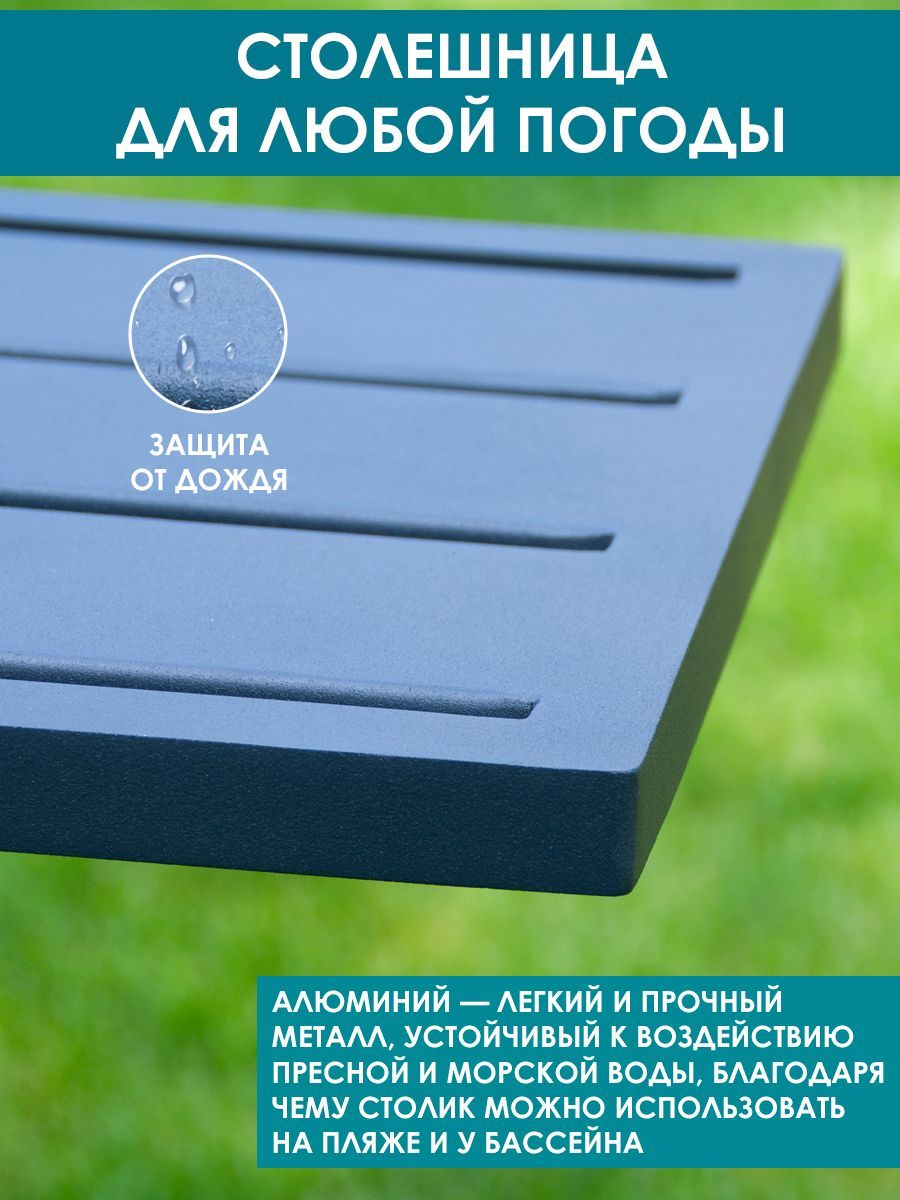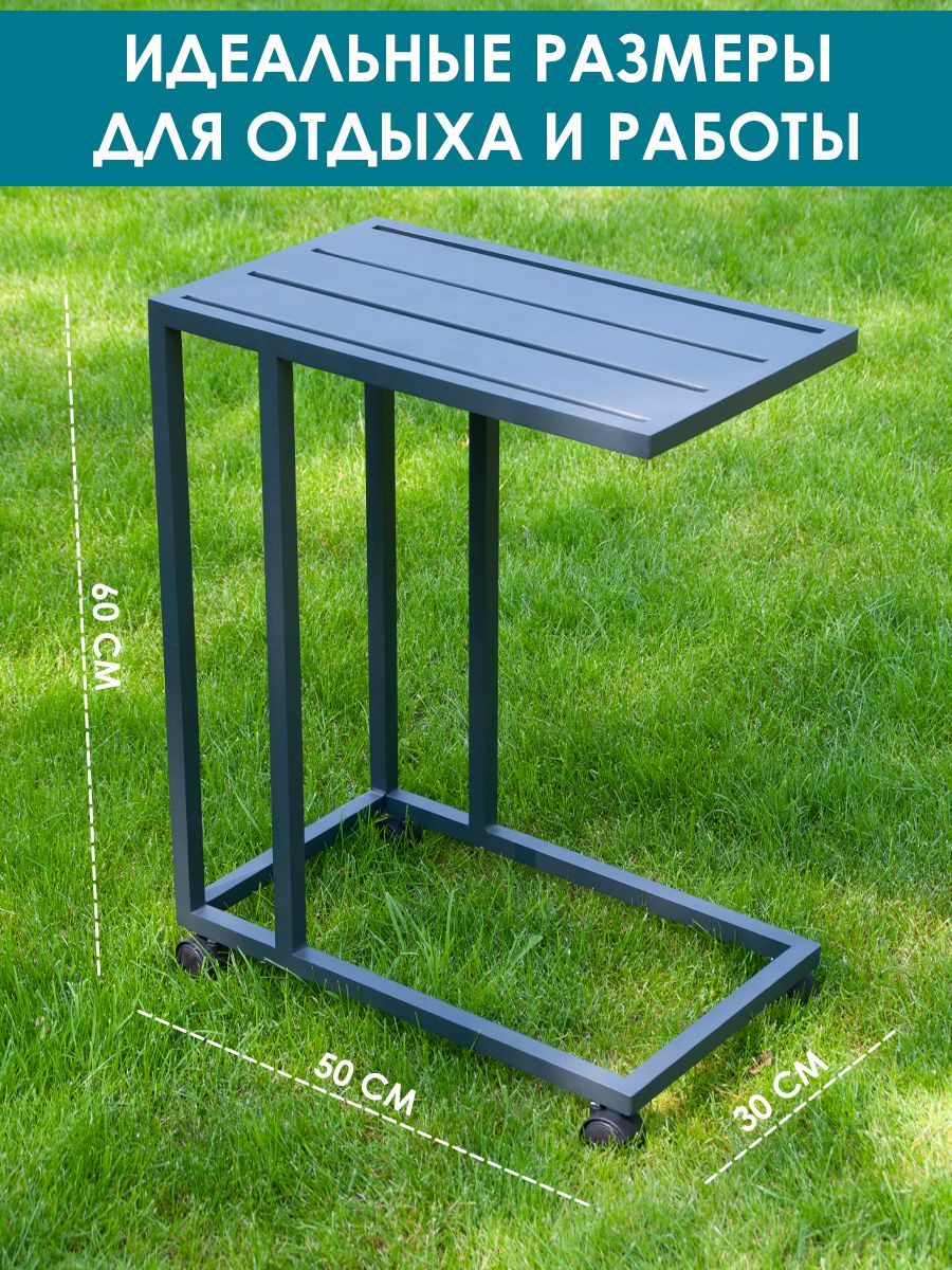 Приставной столик Callisto giardino "Лагуна". Низ и верх: алюминий, окрашенный в цвет антрацит. Регулируемые опоры и колёсики, оба варианта в комплекте. Размеры: ДхШхВ 500х300х600 мм. Вес изделия: 2,8 кг. Продукция поставляется в собранном виде. Нагрузка до 10 кг. Гарантия: 12 месяцев.