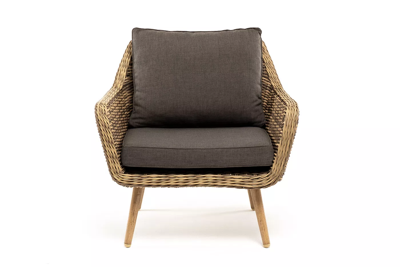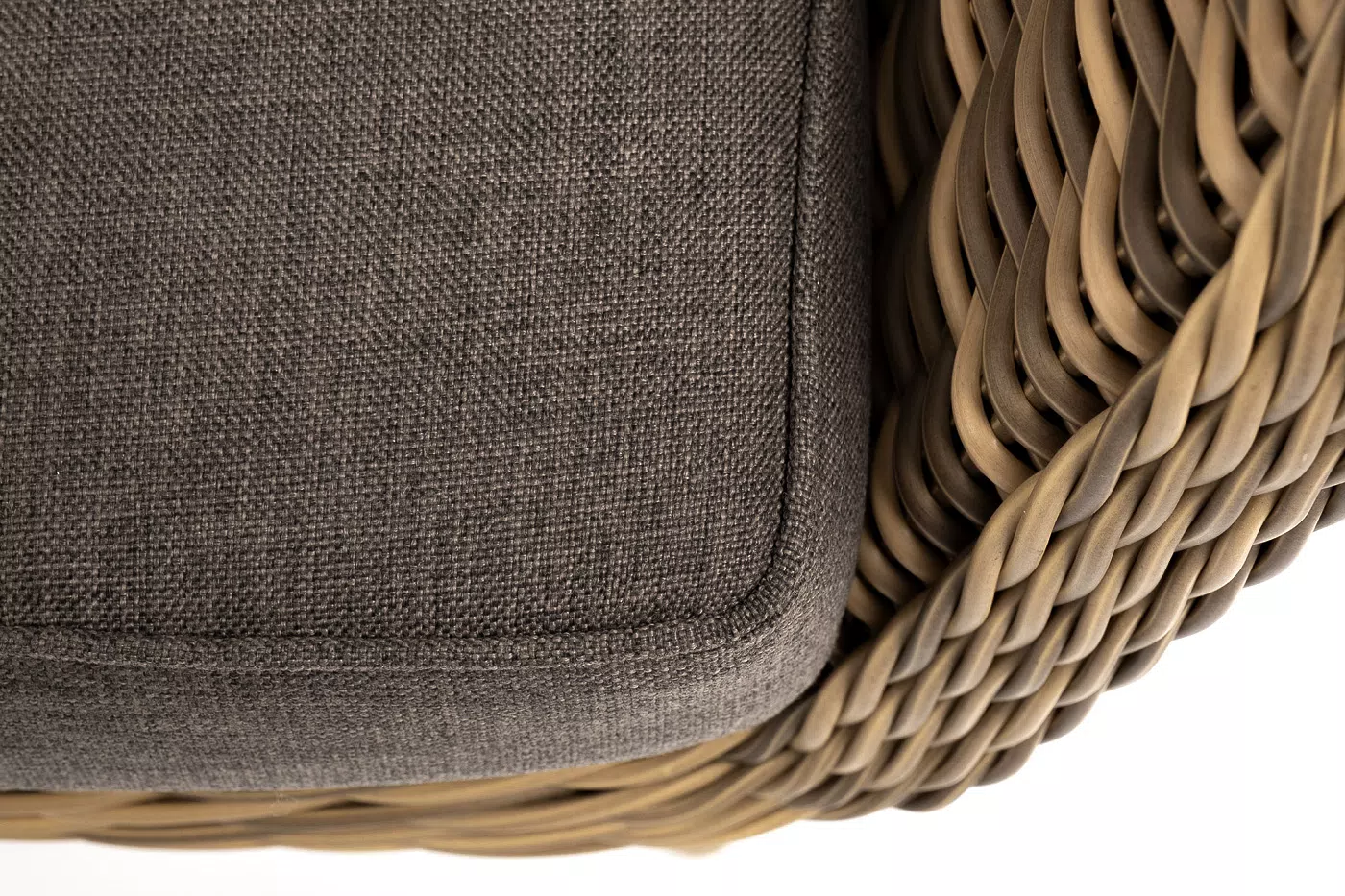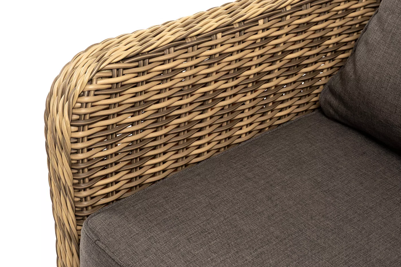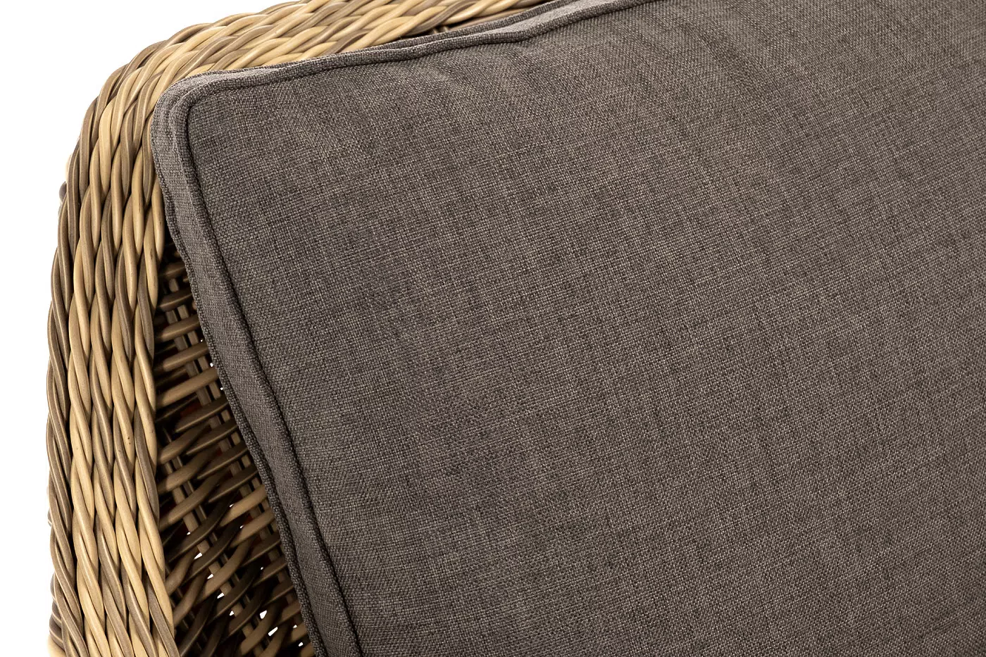 В комплекте с уличным ротанговым креслом идут мягкие подушки со съёмными чехлами серо-коричневого оттенка.