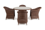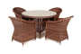 Обеденная группа "Равенна" на 4 персоны из круглого искусственного ротанга, цвет - коричневый. Стулья с подлокотниками в комплекте с подушками серого цвета. Круглый стол со стеклянной столешницей из каленного стекла толщиной 5 мл. Ручное плетение. Алюминиевый каркас. Подушки из водостойкой полиэфирной ткани. "Эспрессо" плетеный круглый стол, диаметр 118 см, цвет коричневый 1шт. 1 180Х1 180Х750, "Равенна" плетеное кресло из искусственного ротанга, цвет коричневый с серой подушкой 4шт. 570Х680Х810,