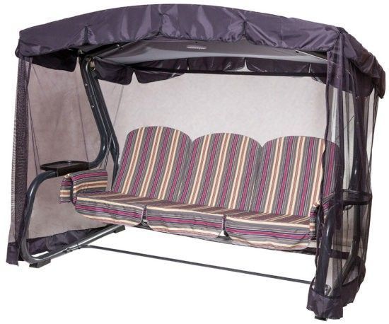 Садовые качели Мастак Премиум с555, 3-х местные. Сочетают в себе отличное качество и приемлемую цену. Раскладываются в двуспальное место, защищены москитной сеткой. Дугообразная форма нижней опоры не позволяет им углубляться в землю.