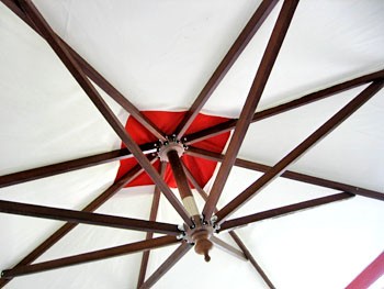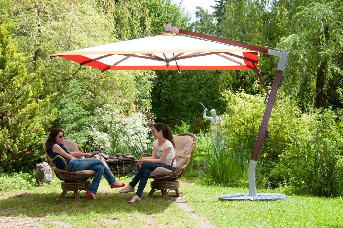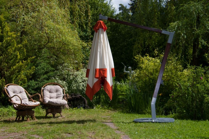 Оснащен прочными и надежными креплениями и системой легкого открытия. Может выполнять функции зонта и тента. Это недорогая альтернатива беседкам в саду, намного более износостойкая и экономичная.