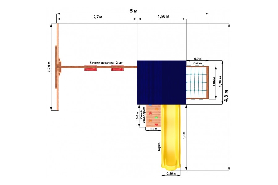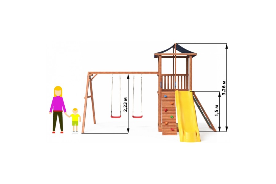 Деревянный игровой комплекс с крышей тент, скалодромом, качелями, горкой и сеткой для лазания. Материал игрового комплекса - лесоматериалы лиственных и хвойных пород, который сушится по специальной технологии, что позволяет не растрескиваться корпусу и несущим конструкциям. Все элементы шлифуются, чтобы не было заусенцев, а также обрабатываются антисептической пропиткой. Пластиковые комплектующие - Польские от ведущего производителя комплектующих для игровых комплексов и детских площадок. При производстве и сборке используется минимальное количество металлических комплектующих, чтобы не поранить ребенка. Количество и размер упаковок
