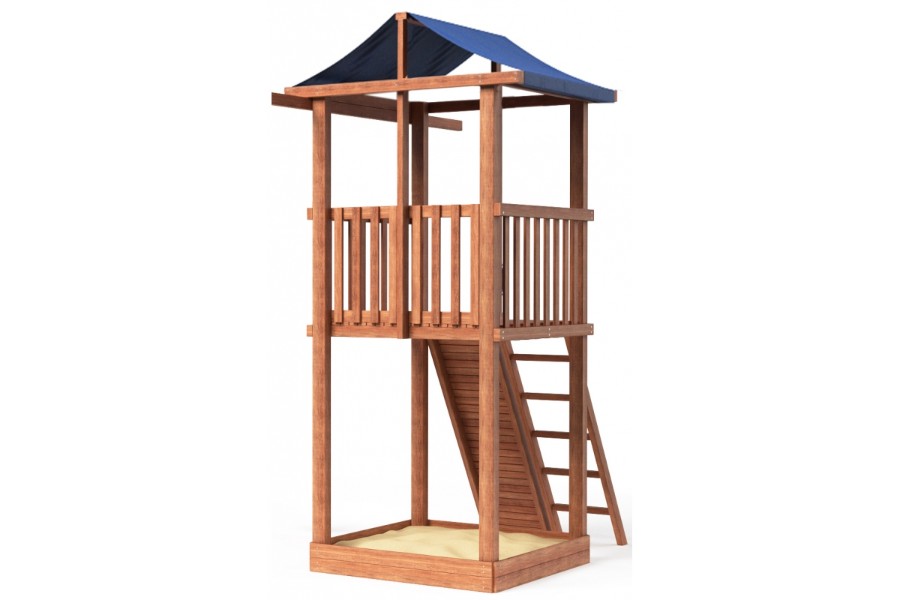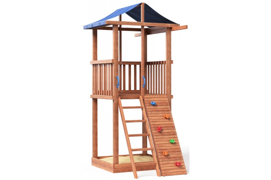 Деревянный игровой комплекс с крышей тент, узкой лестницей и узким скалодромом.