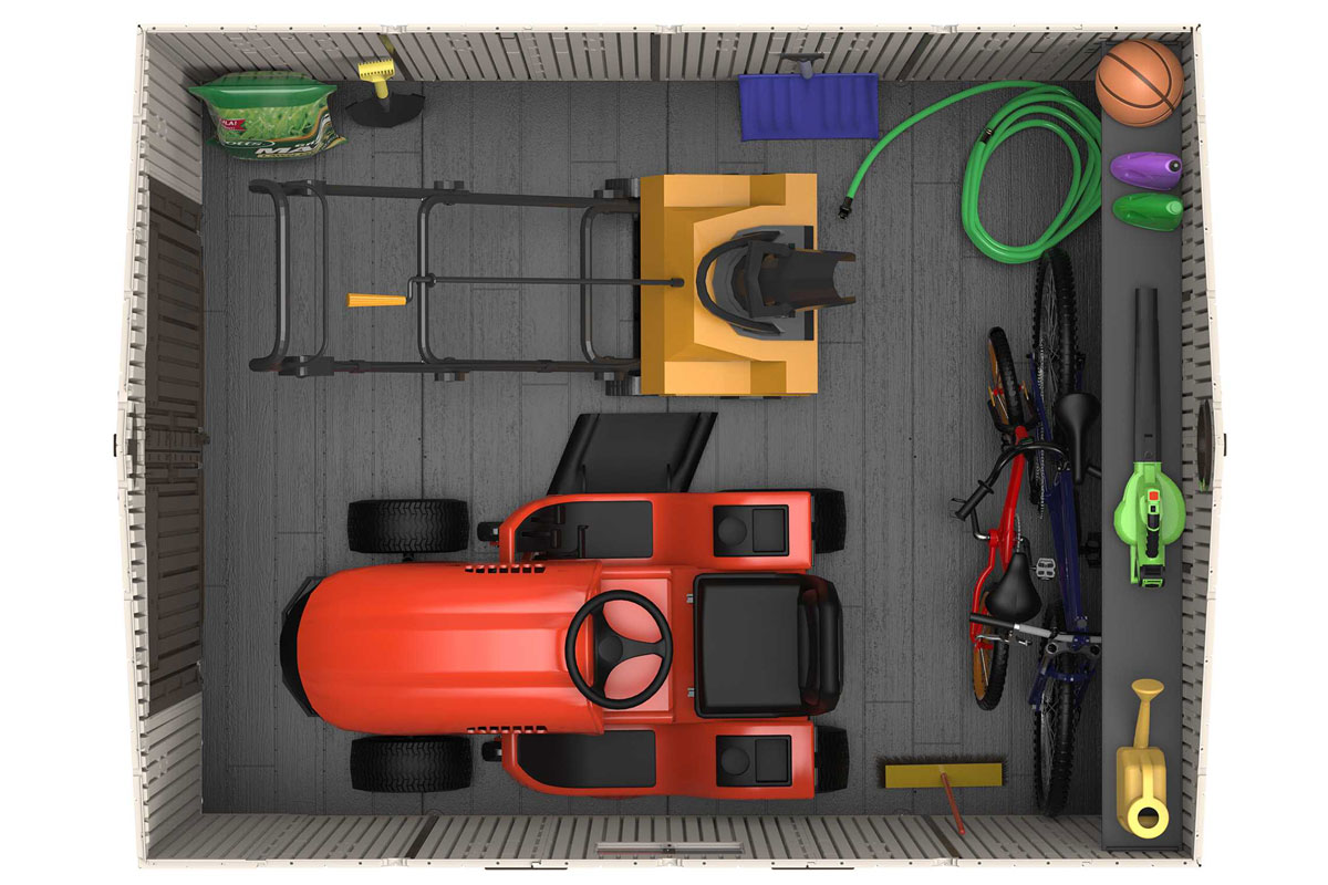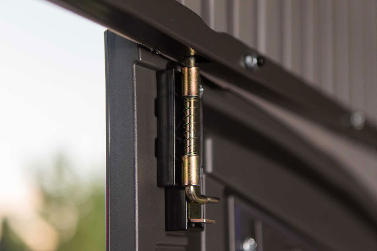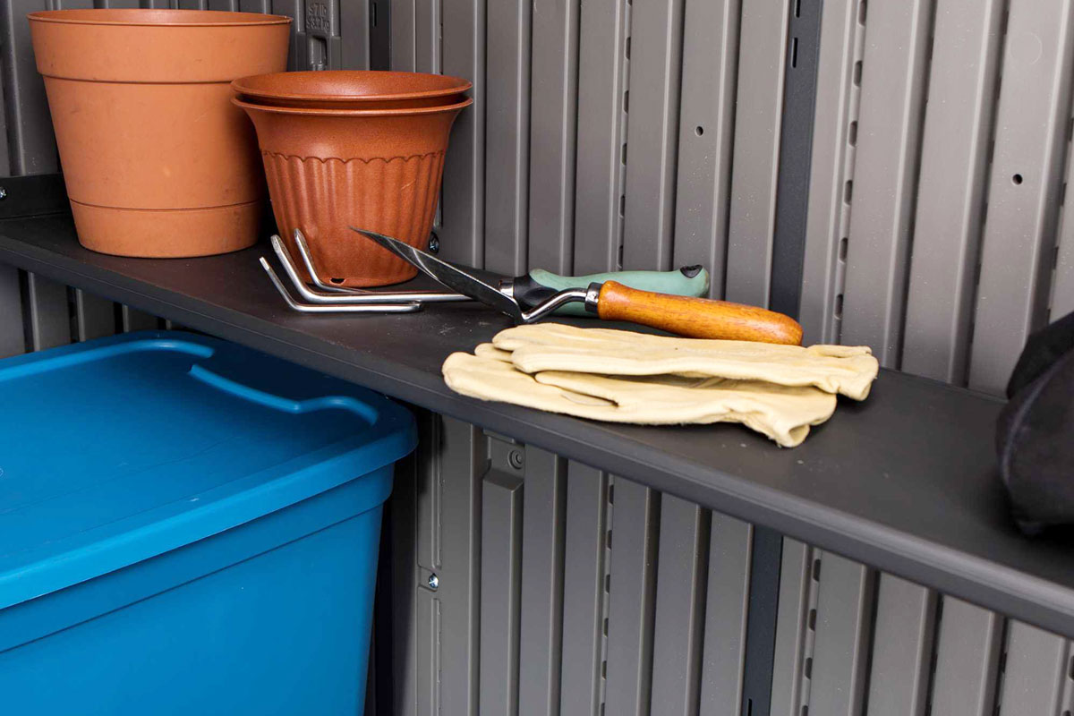 Широкие распашные ворота с антивандальными окнами Окно в фасаде (открывается на половину) - 1шт Экранированные вентиляционные отверстия - 2шт Защелка-слайдер – 1шт Малый световой люк – 4шт Удобные ручки - 2шт Полка с регулируемой высотой - 1шт Настенные крючки – 6шт Напольное и монтажное оборудование А-образные балки крыши – 3шт Направление сайдинга – вертикальный Комплект усилителей от снеговой нагрузкиВарианты применения дачного пластикового сборного сарая Lifetime: