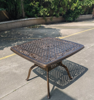 Квадратный металлический стол из литого алюминия рассчитан на 4 персоны, он отлично смотрится на террасе или в беседке, в доме он будет выглядеть очень достойно. Садовая мебель из металла легкая и непритязательна к погодным условиям, ей не страшны перепады температур и погодные капризы, может использоваться на улице в кафе или ресторане.