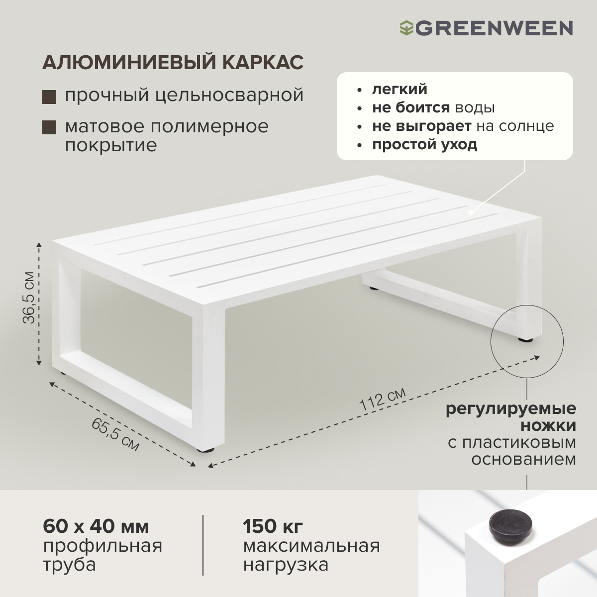 Характеристики: Габариты стола 1120х365х655 мм; Изготовлено из алюминиевых труб с толщиной стенок 3 мм; Регулируемые ножки с пластиковым основанием