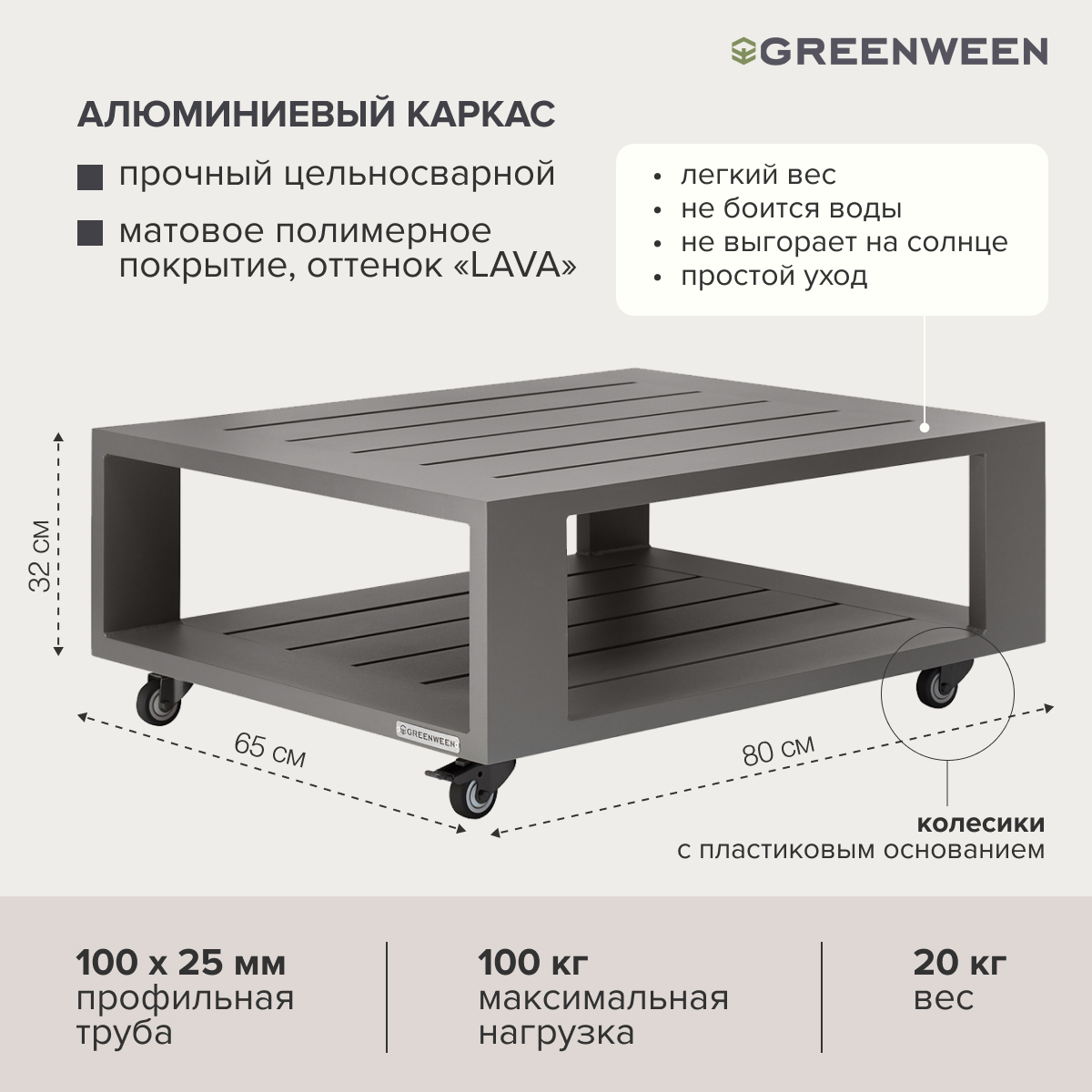 Каркас стола изготовлен из алюминиевой профильной трубы 100х25 мм. Металлическое основание с матовым полимерным покрытием отличается повышенной прочностью, устойчивостью к царапинам. Современное производство GreenWeen гарантирует надежность и эстетику сварных швов металлической мебели.