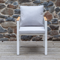 Уличный стул из коллекции мебели SANTORINI привлекает внимание элегантным дизайном и долговечностью. Обеденный стул изготовлен из высокопрочного алюминия белого цвета. Легкий каркас дополняют деревянные подлокотники из лиственницы, для комфортной посадки в комплекте идут 2 удобные подушки в съемных чехлах из мебельной рогожки светло-серого оттенка.