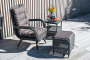 Кресло и пуф укомплектованы подушками со съемными чехлами из влагостойкого 100%-го полиэстера. "Толедо" кресло плетеное с подушками, цвет графит 1шт. 690Х810Х990, "Толедо" пуф плетеный, цвет графит 1шт. 510Х420Х470, "Форио" столик кофейный из искусственного ротанга, цвет графит 1шт. 450Х450Х520,