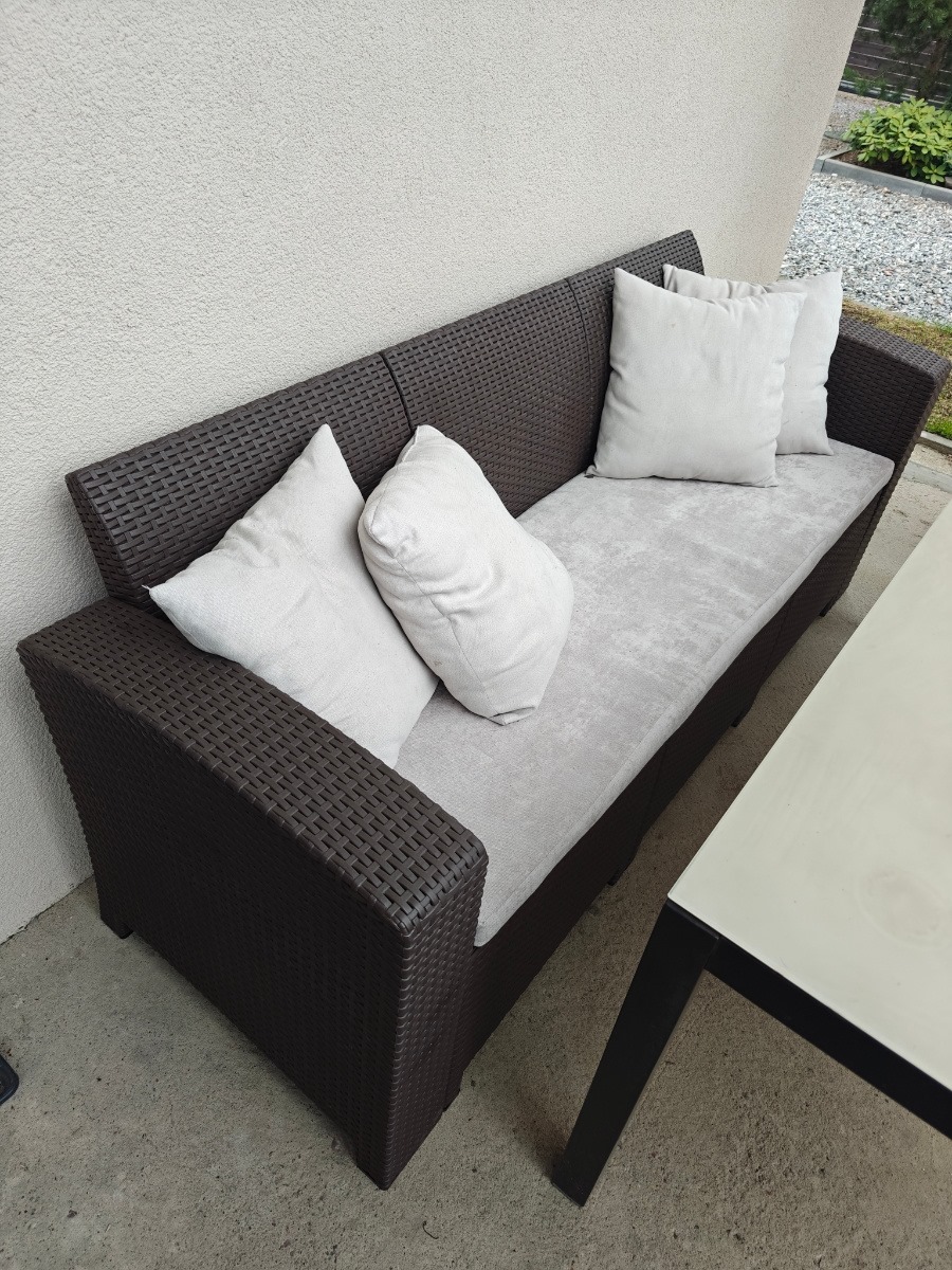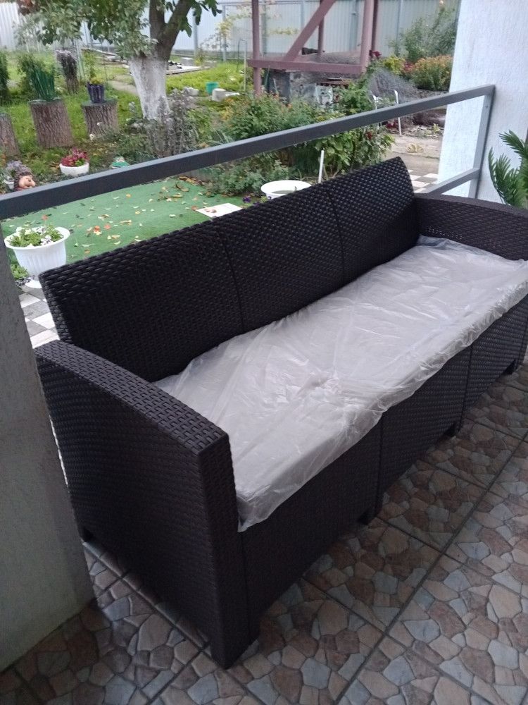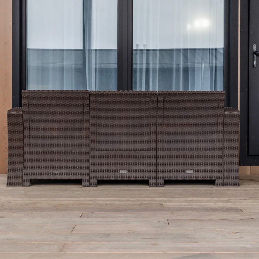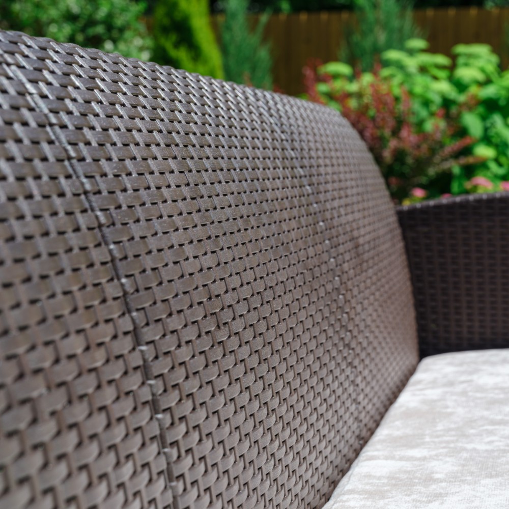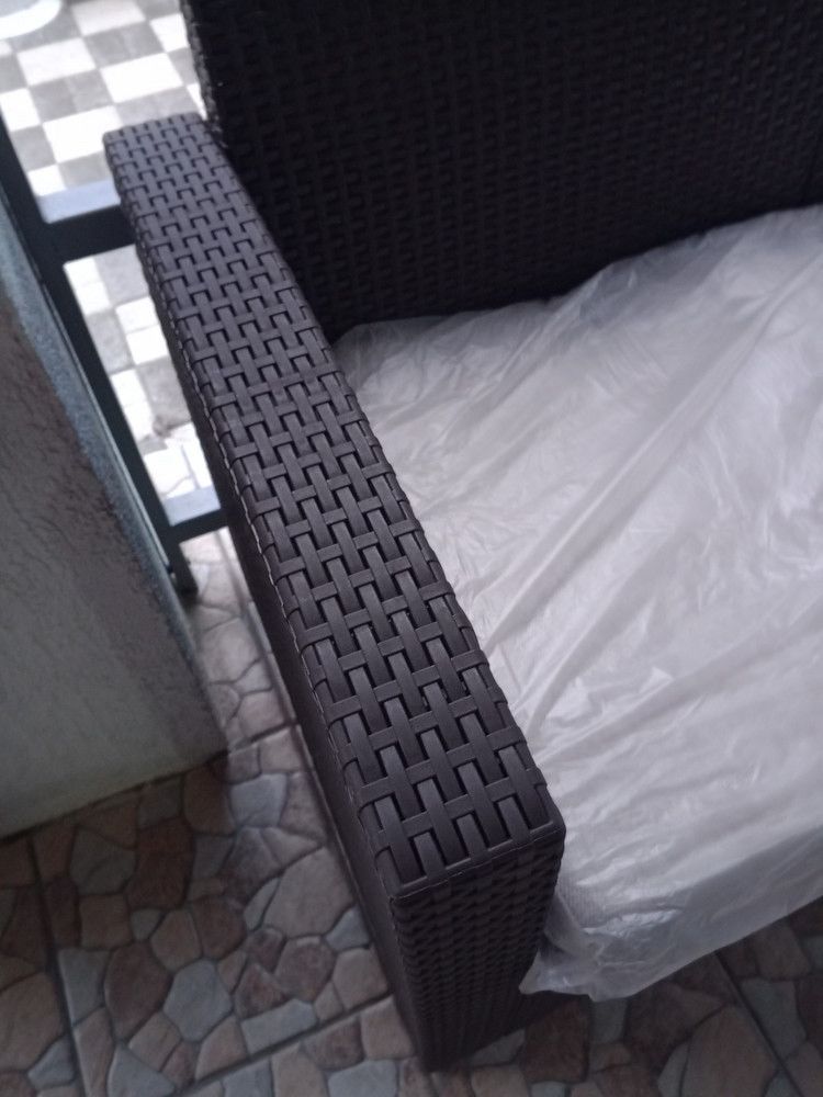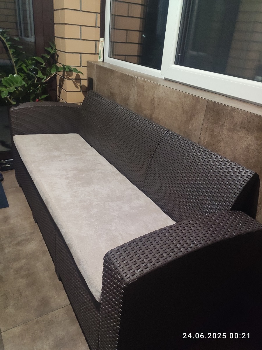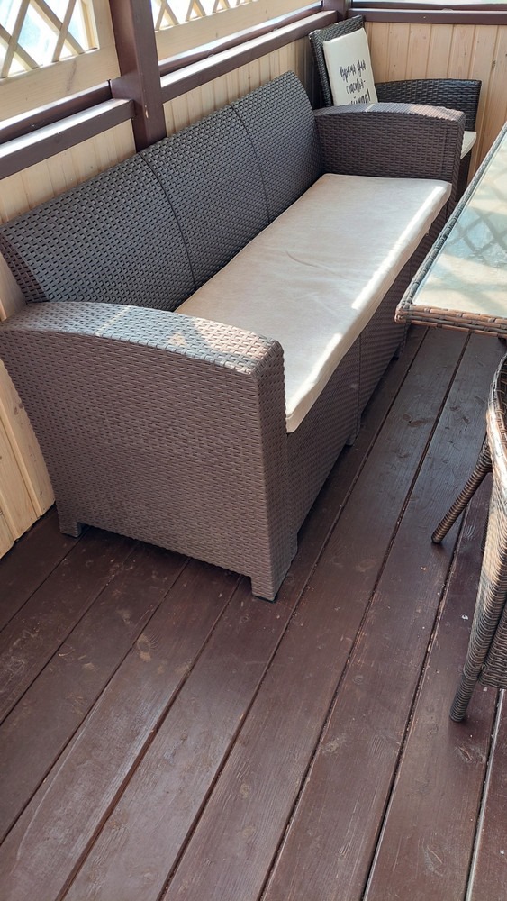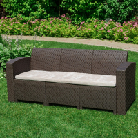 Широкое сиденье, мягкие подушки и удобная спинка обеспечивают комфортную посадку для трёх человек. Материал — прочный пластик с плетёной текстурой, устойчивый к солнцу, влаге и перепадам температур. Диван не выцветает, не требует сложного ухода и надолго сохраняет аккуратный внешний вид.