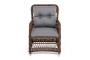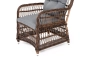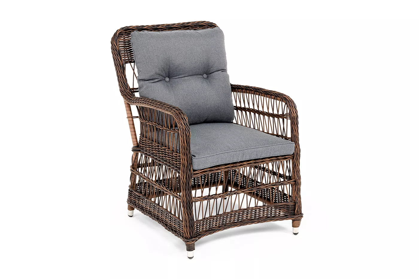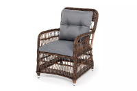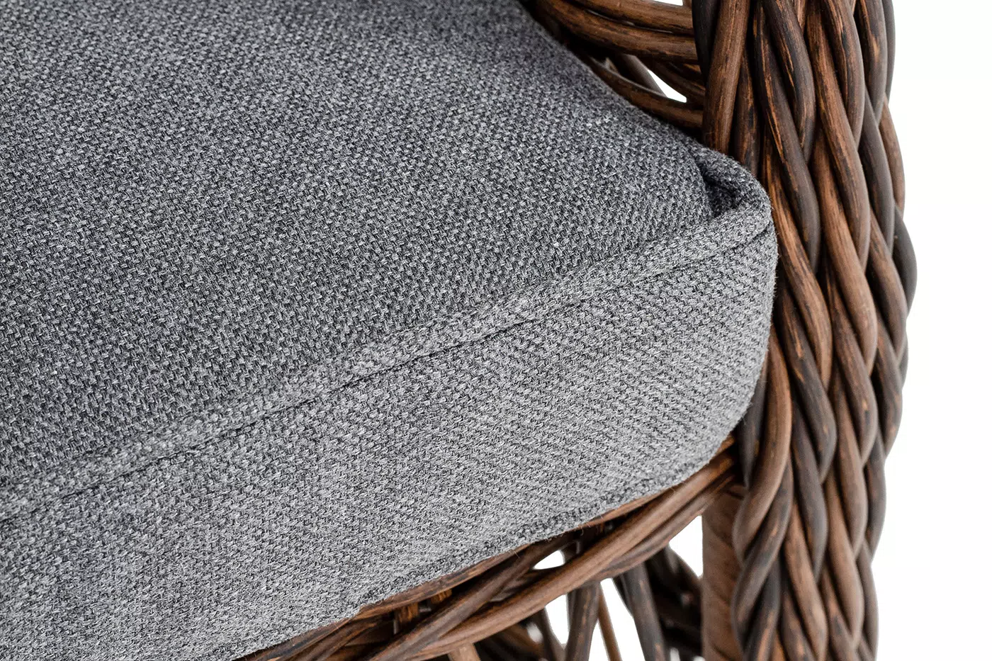 Садовое кресло располагает двумя мягкими подушками, которые идут в комплекте. Они выполнены в сером цвете. Полиэстер высокого качества используется при пошиве тканевых изделий. Его плотность 300 гр/м2. Ткань обрабатывается влагоотталкивающей пропиткой.