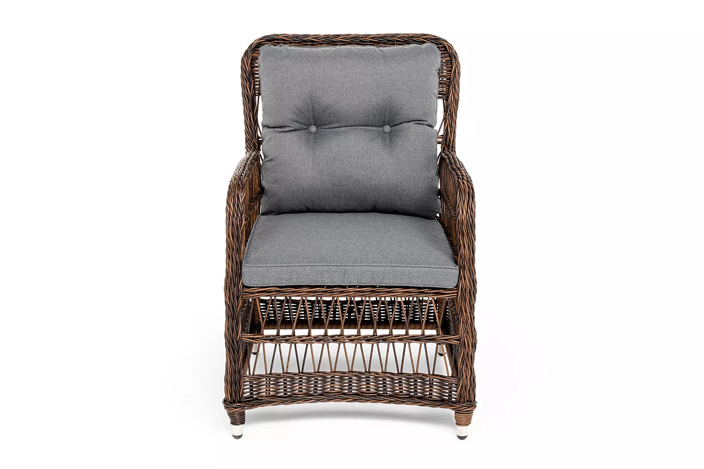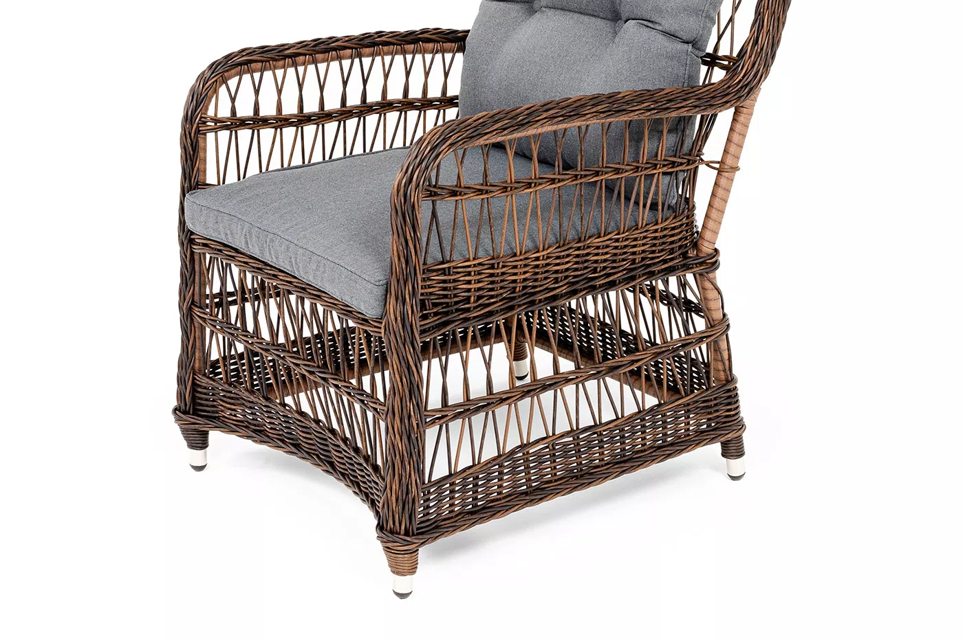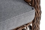 Алюминиевый каркас находится в основе мебели. Он характеризуется устойчивостью и высокой прочностью. Задекорирован ручной круглой оплеткой, которая сделана из искусственного ротанга. Представлена в коричневом оттенке.