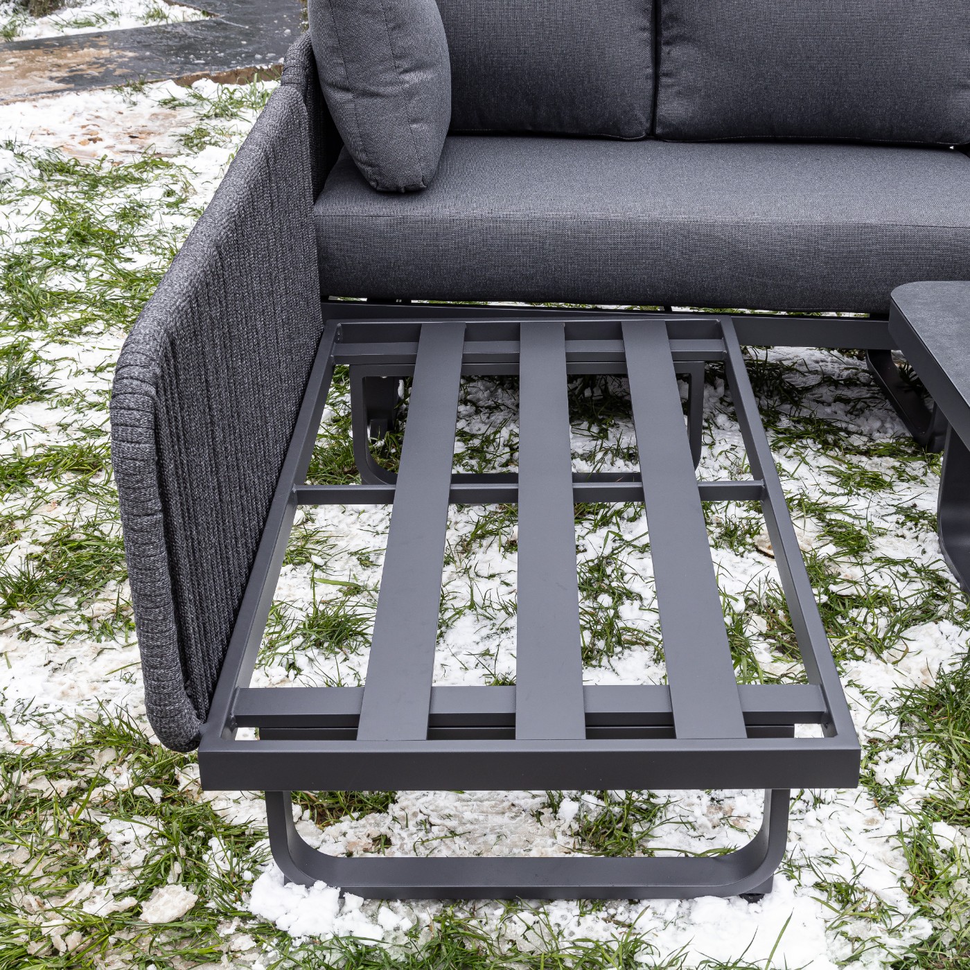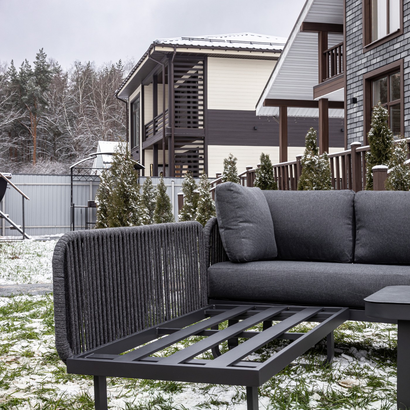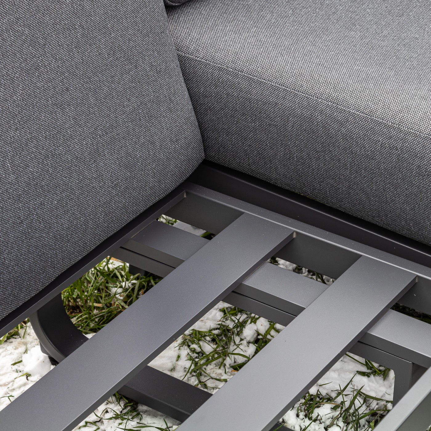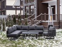 Угловая лаунж-зона из алюминия ADRIAN - это современный и стильный обеденный комплект, который будет отлично смотреться в любом интерьере. Он включает в себя два удобных кресла, трехместный диван и прочный обеденный стол.