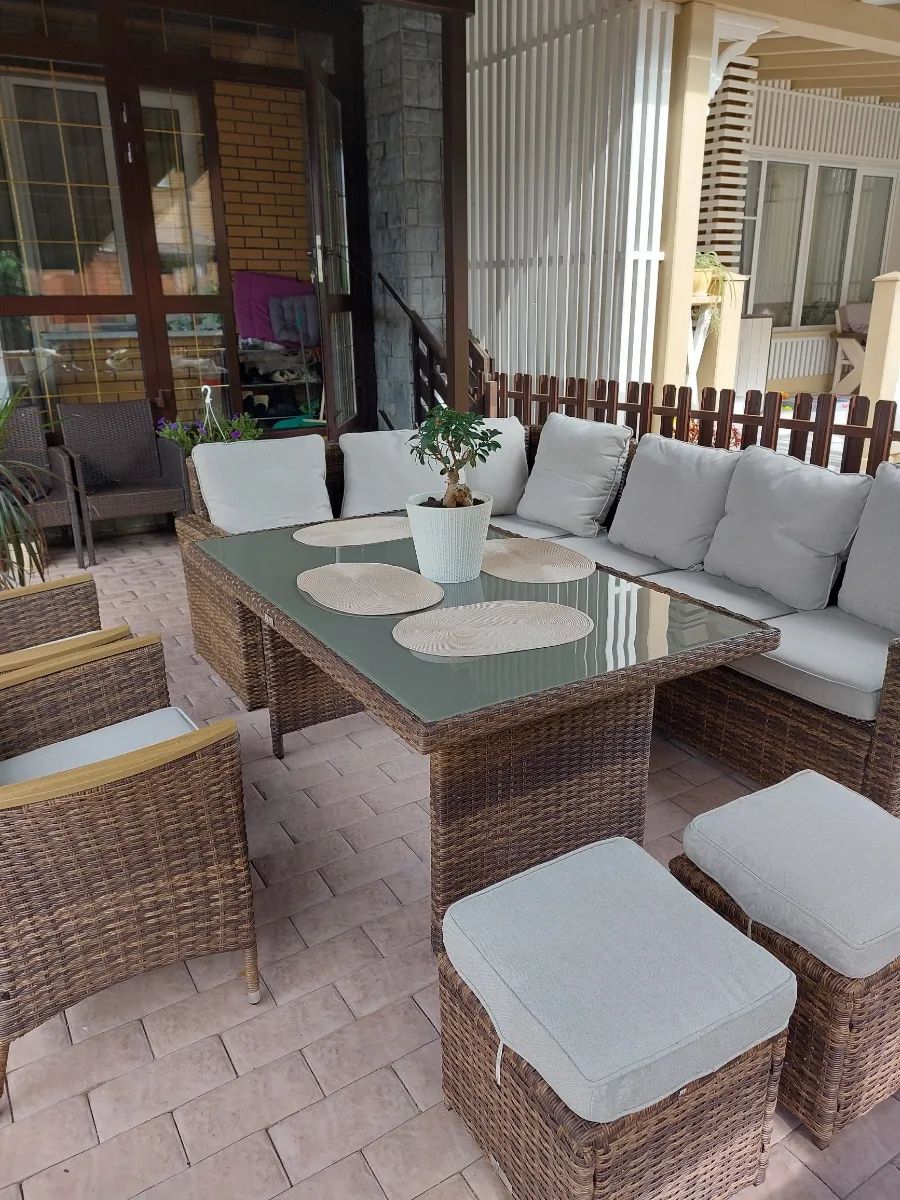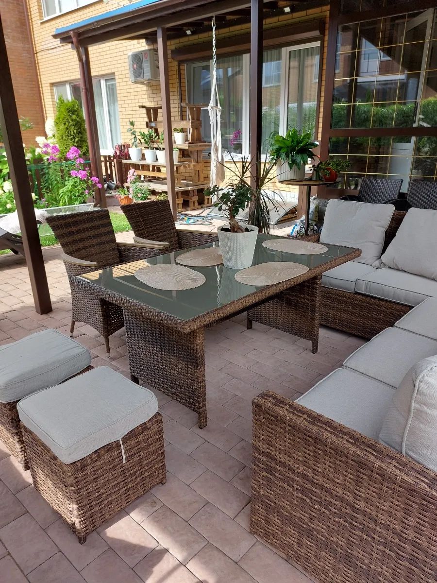 Искусственный ротанг ручного плетения на прочном стальном каркасе сочетает изысканность и долговечность. Набор рассчитан на 9-11 персон, что делает его идеальным выбором для тех, кто любит принимать гостей с размахом.