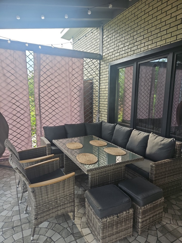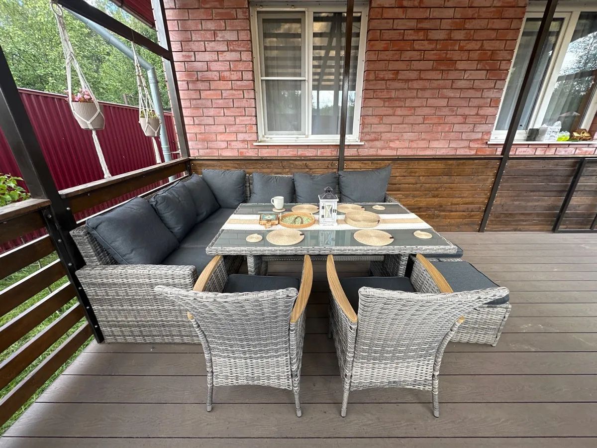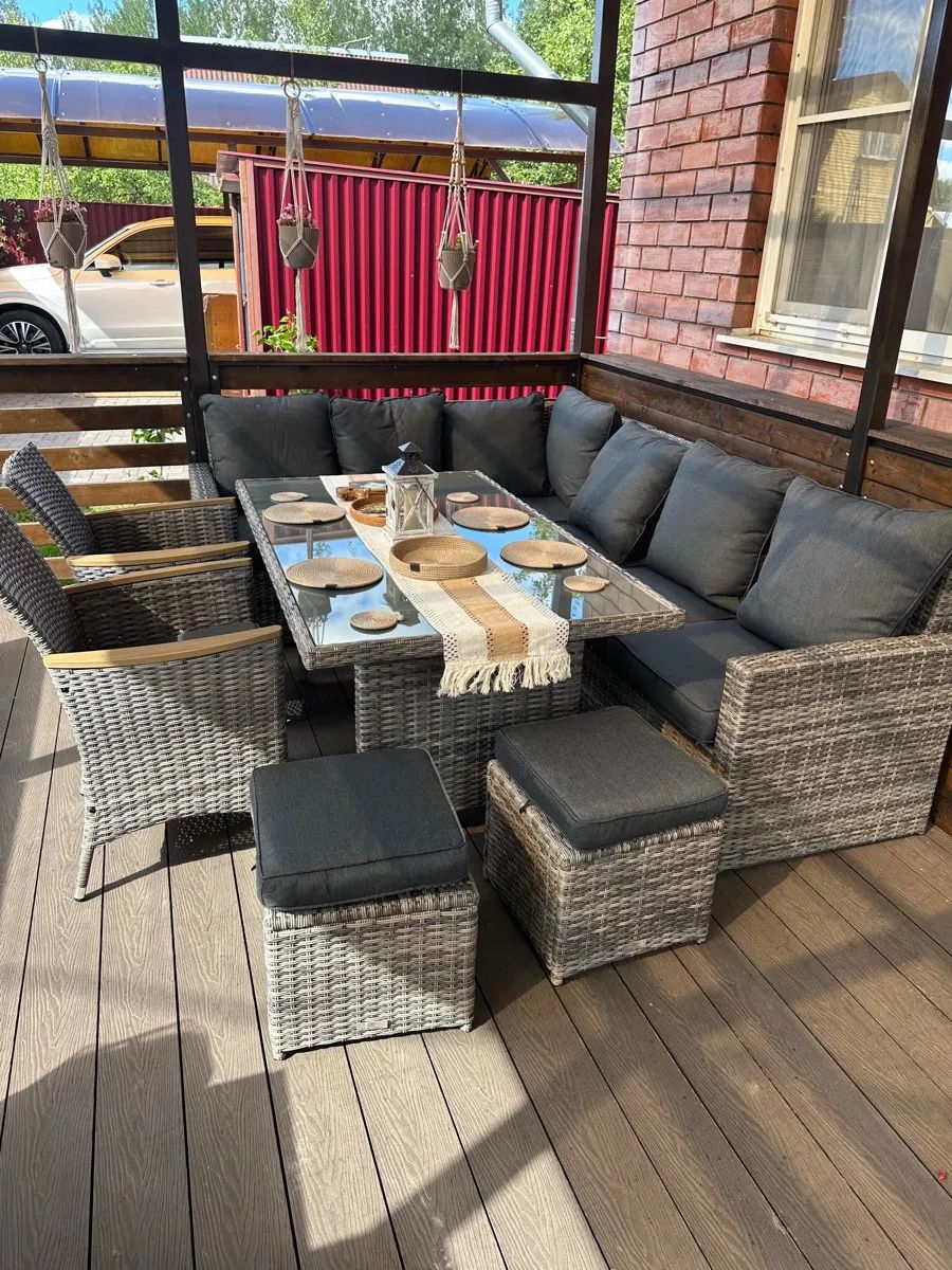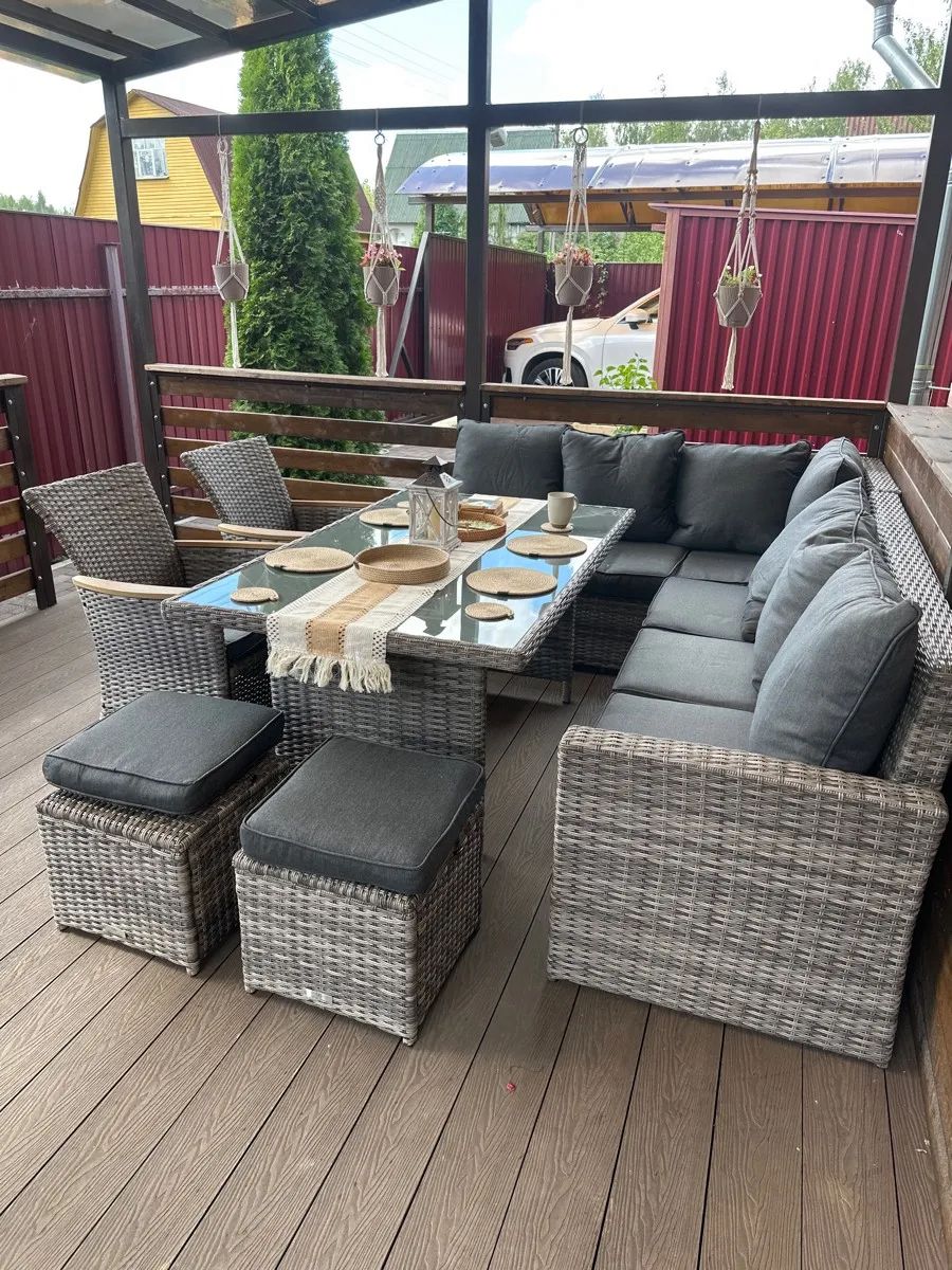 Искусственный ротанг ручного плетения образует гармоничный ансамбль с прозрачной стеклянной столешницей, создавая впечатление легкости и воздушности. Угловая композиция из диванов и кресел с поливудовыми подлокотниками предлагает комфортное размещение для большой компании.