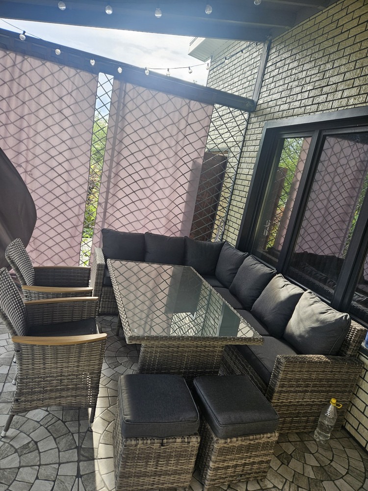 Серые подушки из водоотталкивающей ткани мягко контрастируют с основным цветом мебели, завершая современный образ. Прочные стальные каркасы и морозоустойчивые материалы делают этот комплект верным спутником в любое время года.
