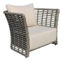 Кресло оснащено каркасом из прочного алюминия, ручное круглое плетение является основным декоративным элементом мебели. Оно выполнено из искусственного ротанга в сером цвете.