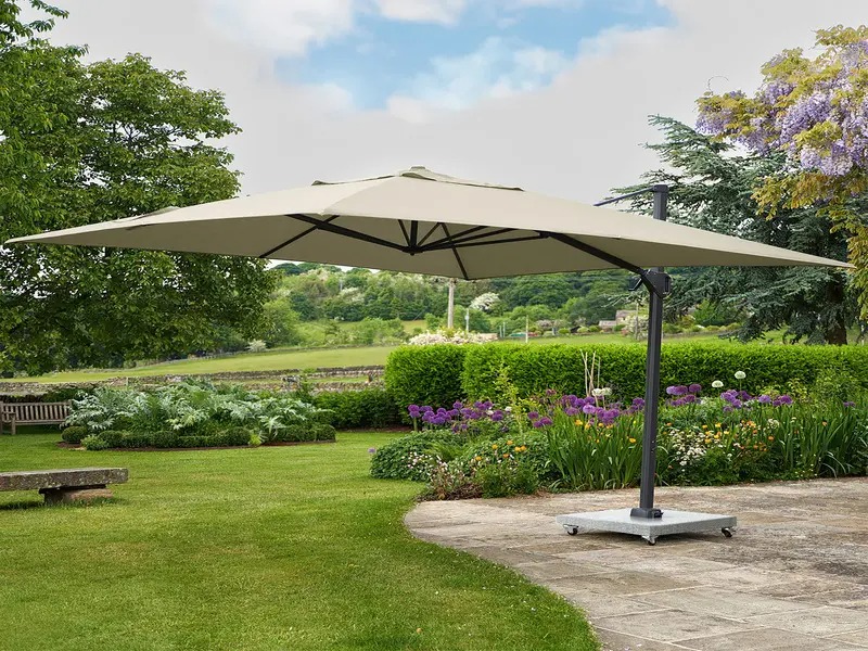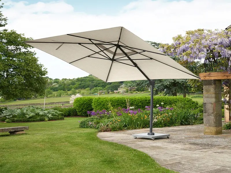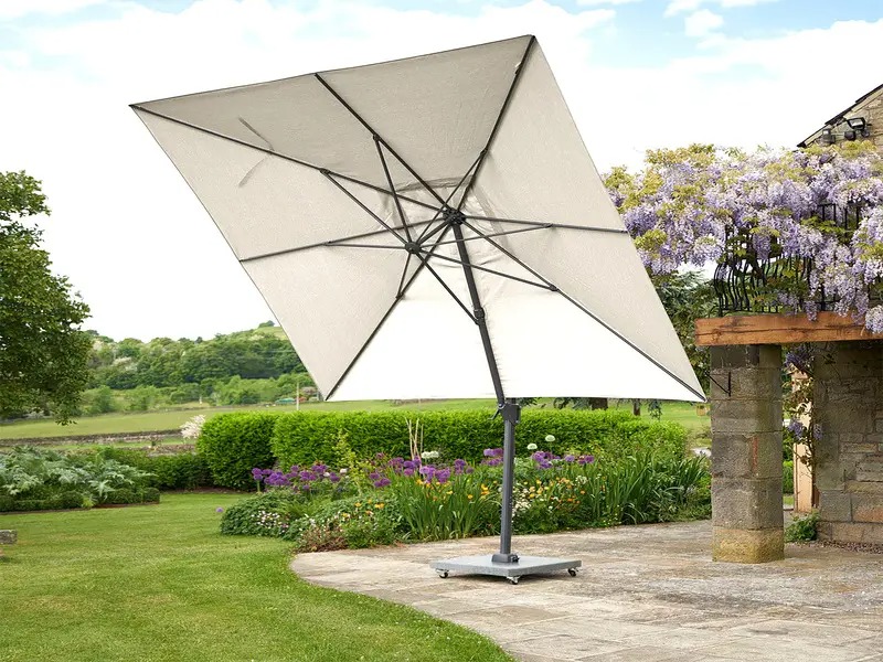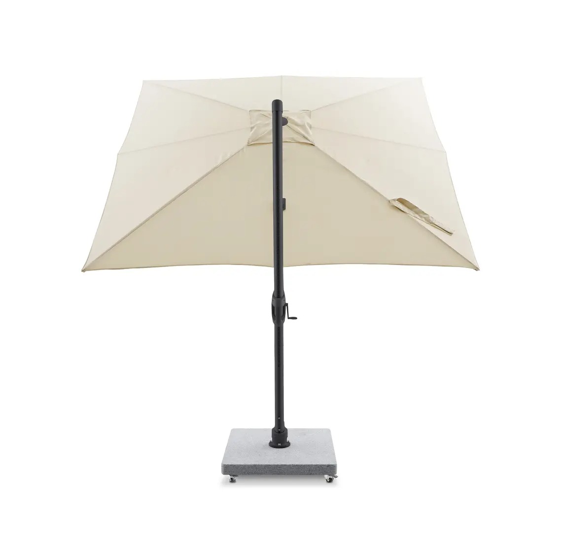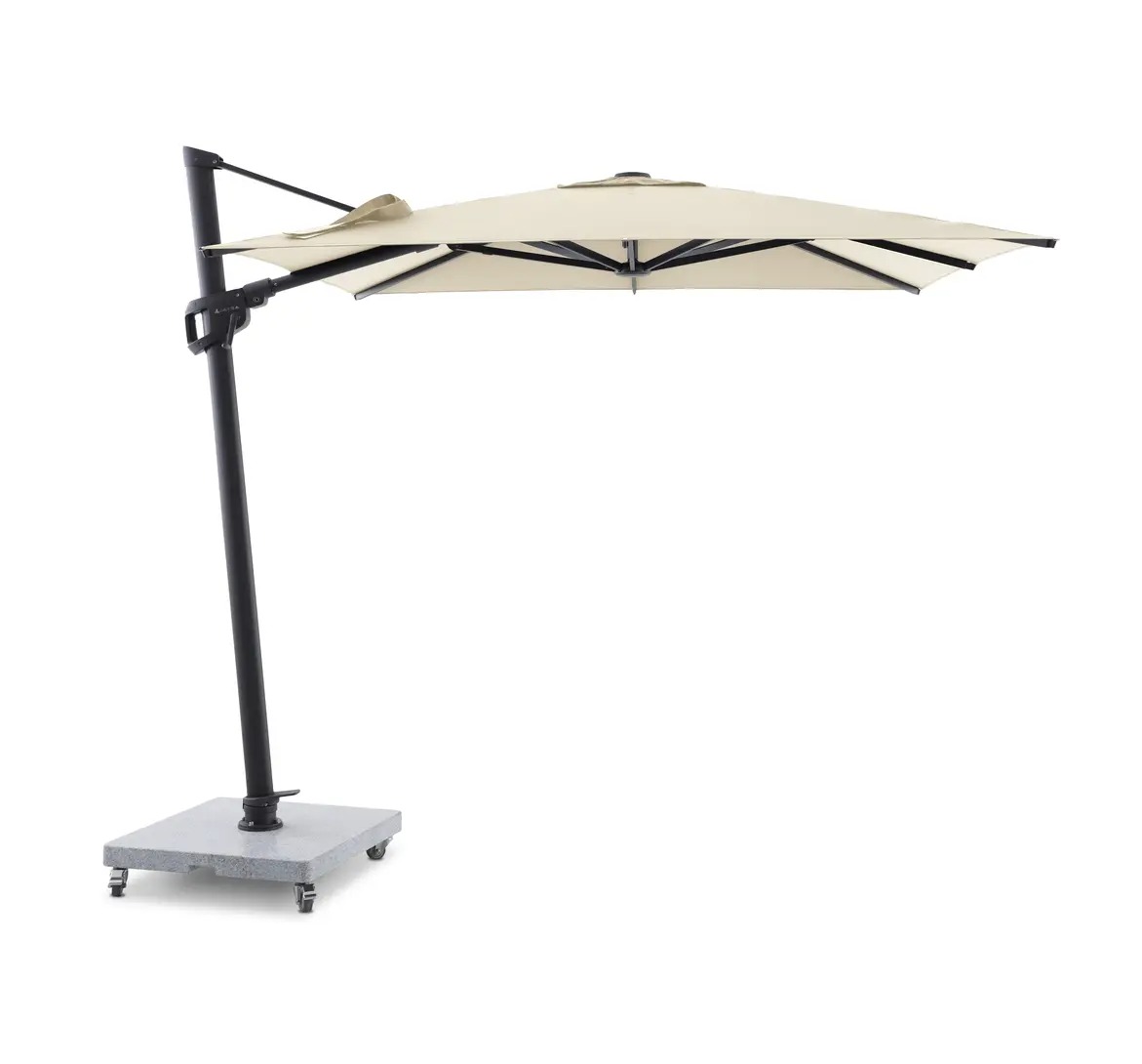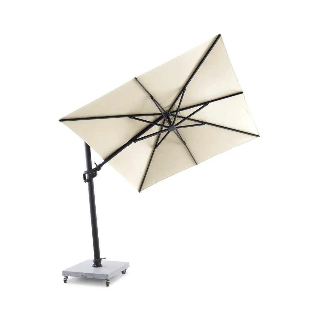 Основание зонта: гранит, вес - 130 кг, квадратная форма, размер: 80x80x6 см светло-серая полировальная поверхность, с колесами.