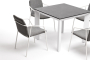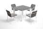 - 4 стула "Марокко" из текстилена nanotex, современного материала для обивки мебели, размером - 575х600х800 мм, каркас белого цвета изготовлен из алюминия, что делает стул прочным и легким. "Венето" обеденный стол из HPL 90х90см, цвет "серый гранит", каркас белый 1шт. 900Х900Х750, "Марокко" стул из текстилена nanotex, алюминиевый каркас, цвет серый 4шт. 575Х600Х800,