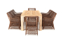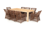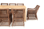 Обеденная группа на 8 персон. Стол из тикового дерева. Все стулья с подлокотниками и подушками, алюминиевый каркас, искусственный ротанг коричневого цвета. "Витория" деревянный стол из натурального тика, 200х100см 1шт. 2 000Х1 000Х770, "Латте" плетеное кресло из искусственного ротанга, цвет коричневый 8шт. 550Х660Х850,