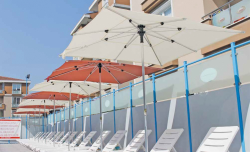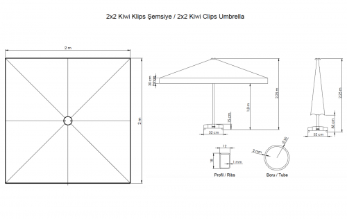 Kiwi Clips - профессиональный зонт с центральной опорой из алюминия. Цельная опора обеспечивает высокую устойчивость модели. Он защитит от ярких солнечных лучей и создаст приятную затененную атмосферу в частных садах, открытых летних площадках кафе, баров и ресторанов, зоны возле бассейна.