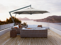 - Купол выполнен из акрила 350 г/м² с пропиткой. Варианты цвета: слоновая кость (A1), терракота (T2), бордовый (T3), серо-коричневый (T6), белый (T7), серебристо-серый (T8), антрацит (T9), черный (S1). Цена на сайте указана для зонта с куполом в цвете слоновая кость (A1) без волана.