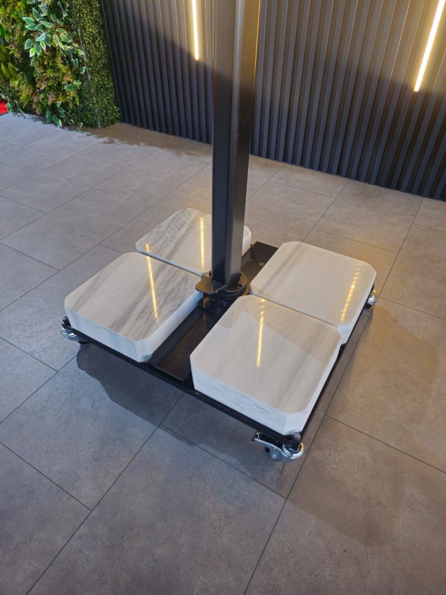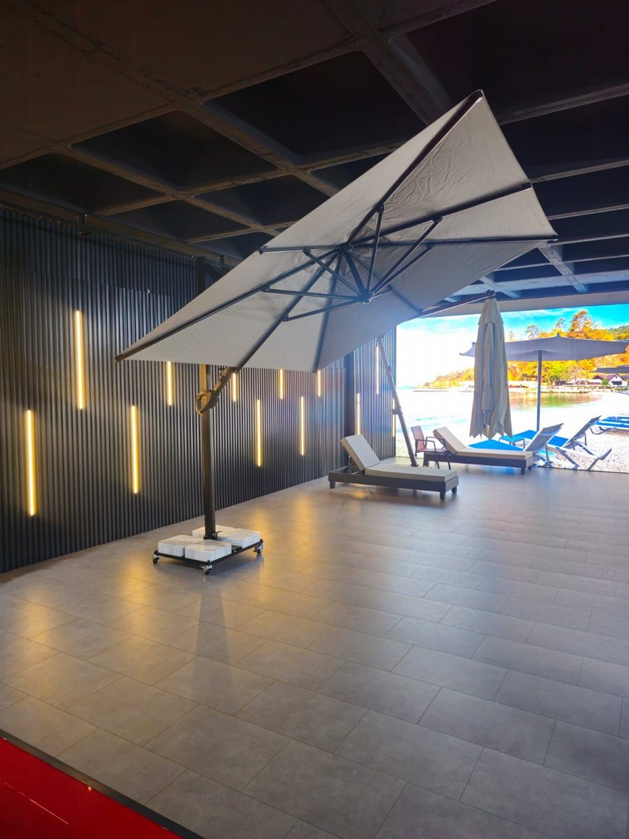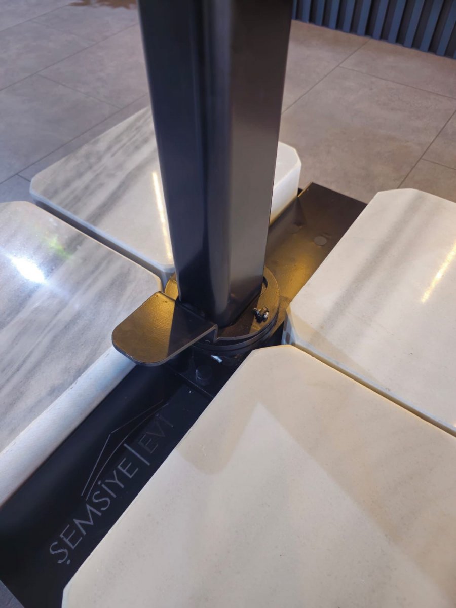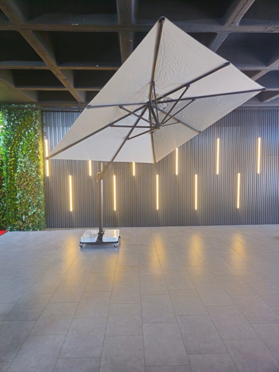 - Боковая опора сечением 70х70 мм и толщиной стенки 2.5 мм выполнена из окрашенного алюминия со специальной термообработкой, которая повышает прочность и коррозионную стойкость зонта. Высота опоры - 3100 мм.