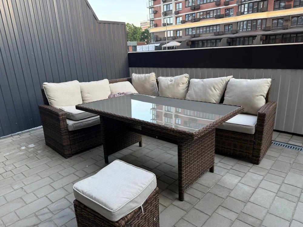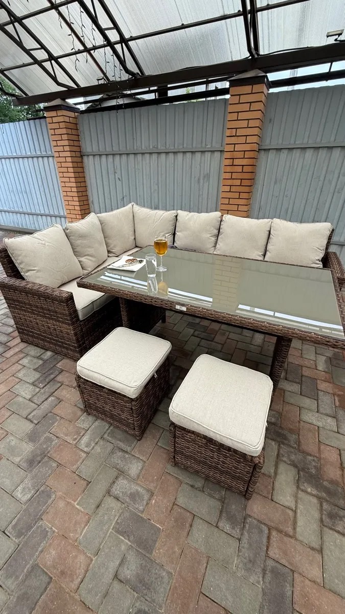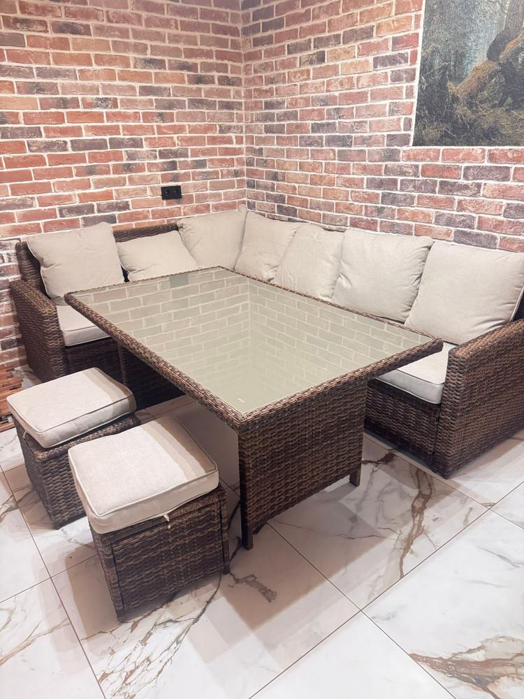 В состав набора входит вместительный угловой диван, а также два пуфа с мягкими подушками-сидениями, которые дополнены высоким обеденным столом со столешницей из закаленного стекла прямоугольной формы. Комплект обеспечивает возможность комфортного размещения компании из 5-7 человек, а размеров стола вполне достаточно для расстановки всех любимых блюд и напитков. Садовая мебель ZORRO выполнена в лаконичном современном дизайне с декоративной отделкой из искусственного ротанга, плетение которого осуществлено ручным способом. Благодаря сочетанию мягких коричневых оттенков набор отлично вписывается в любое открытое пространство, а в зимнее время года может дополнить интерьер просторной гостиной, оформленной в современном или традиционном стиле.Мебель ZORRO – практичность и долговечность